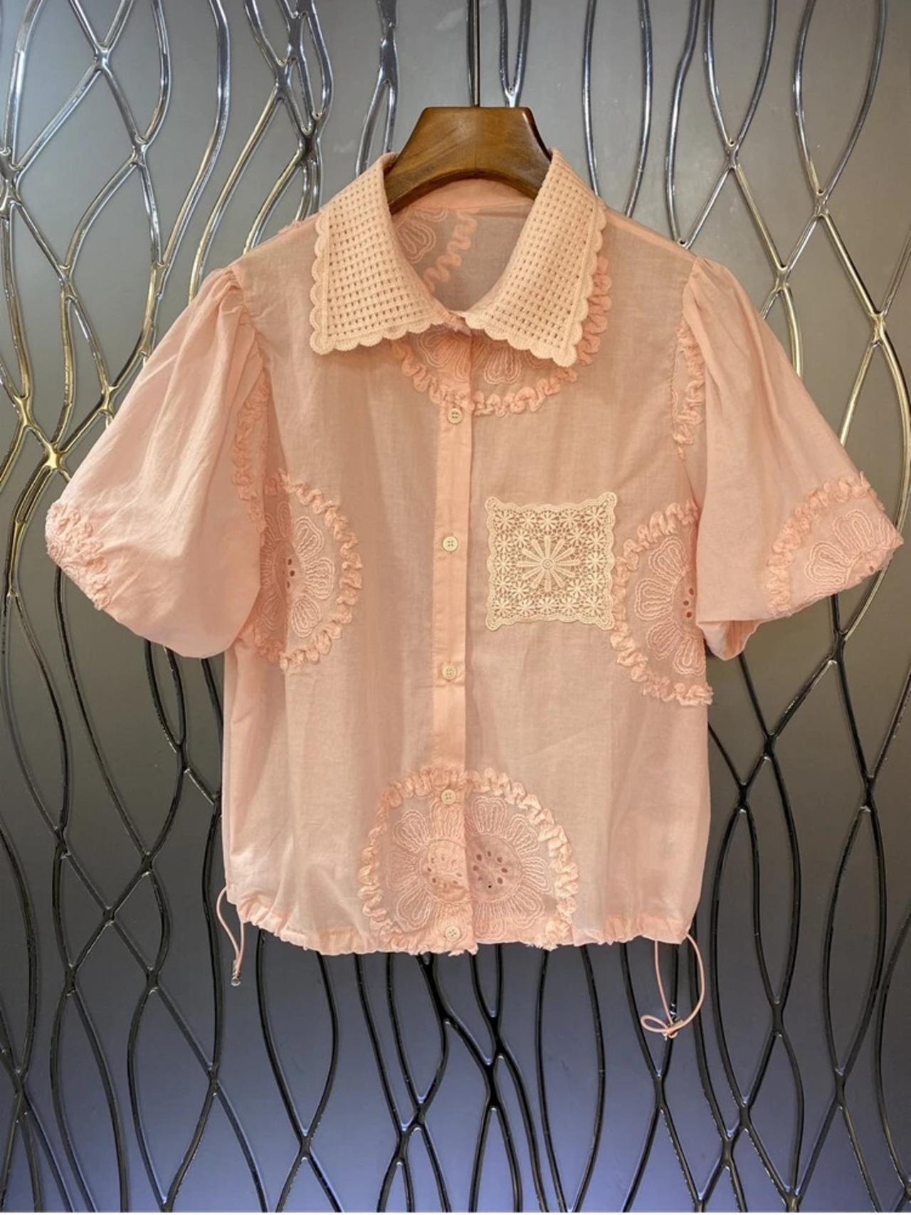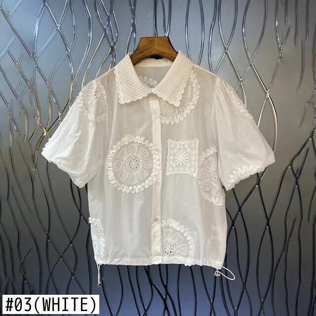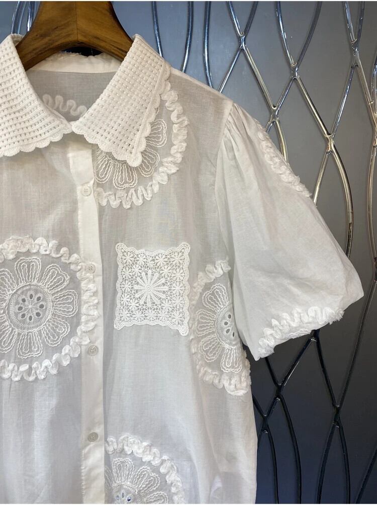 Nomikuma フレンチシック刺繍裾巾着パフスリーブシャツレディース 2024 夏ニッチスイートトップ 大人ガーリー スウィート キュート カジュアル サマー 夏物