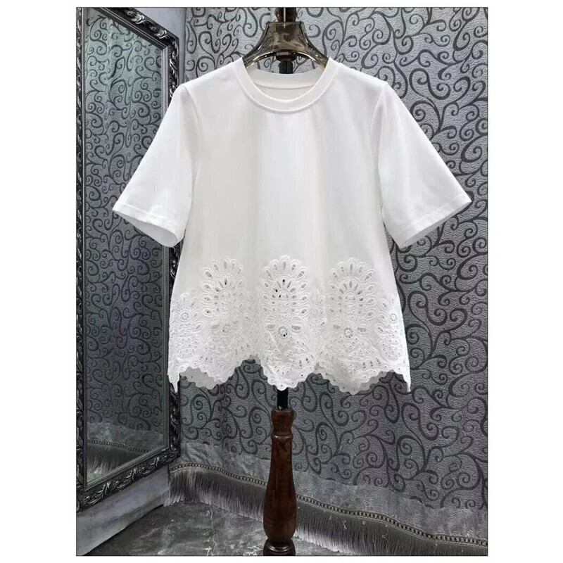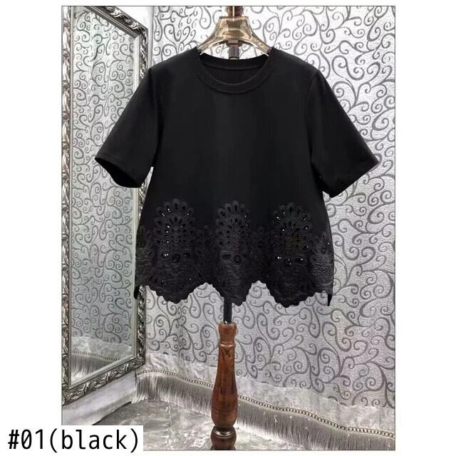 Nomikuma フランス刺繍くり抜きラウンドネック半袖 Tシャツレディース 2024 夏ニッチカジュアルシックトップ ショート ハーフスリーブ サマー 夏物 Oネック