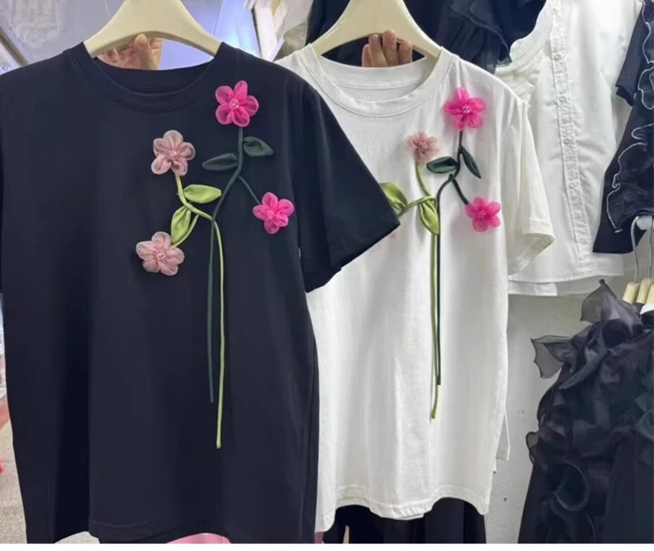 Nomikuma ニッチ立体フラワー Tシャツ レディース 2024 夏 因果万能ラウンドネックトップ サマー 夏物 Oネック フラワーデザイン
