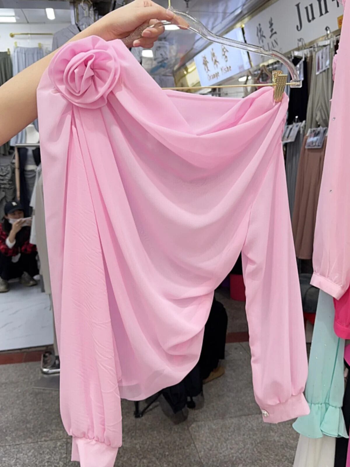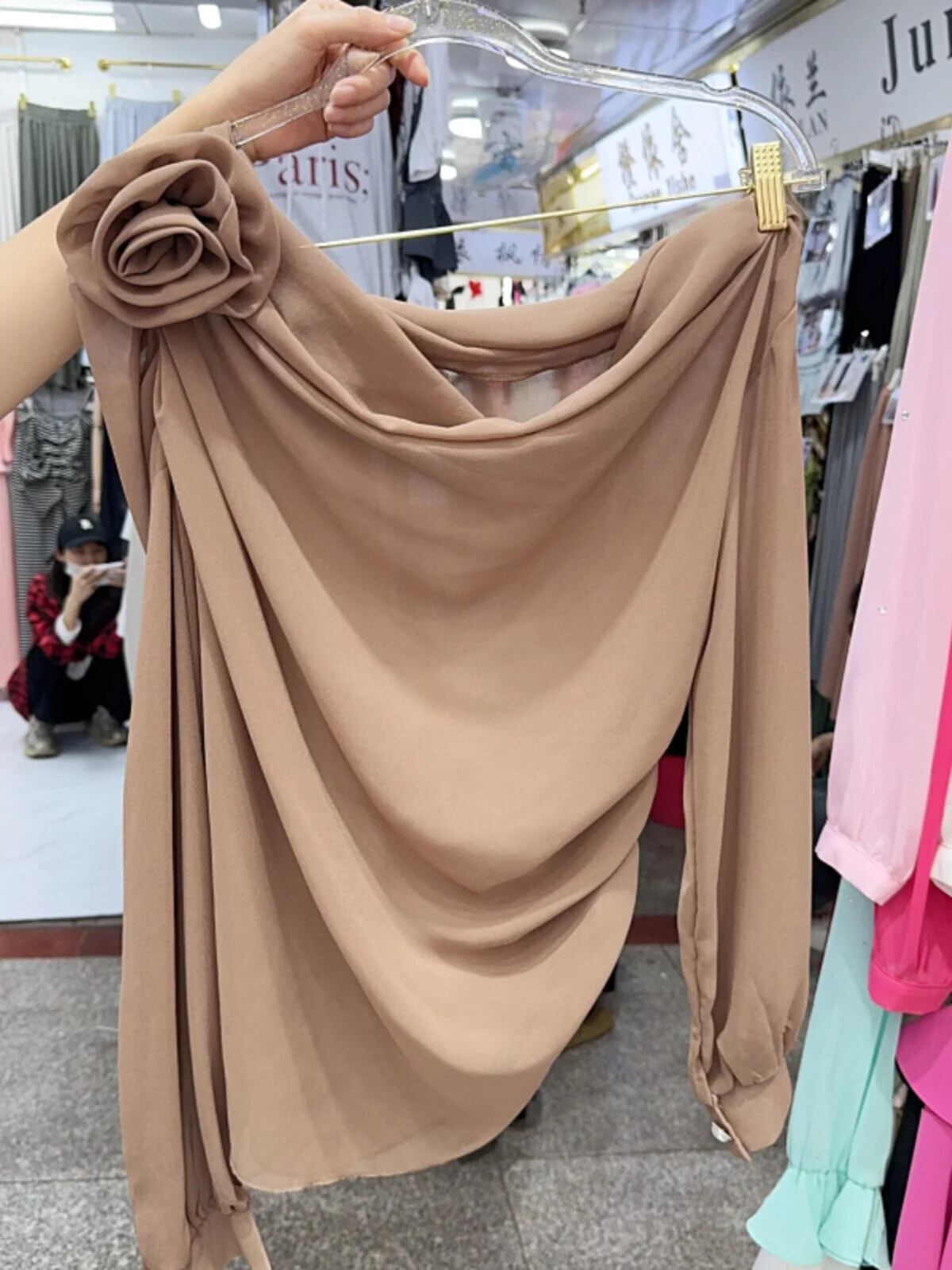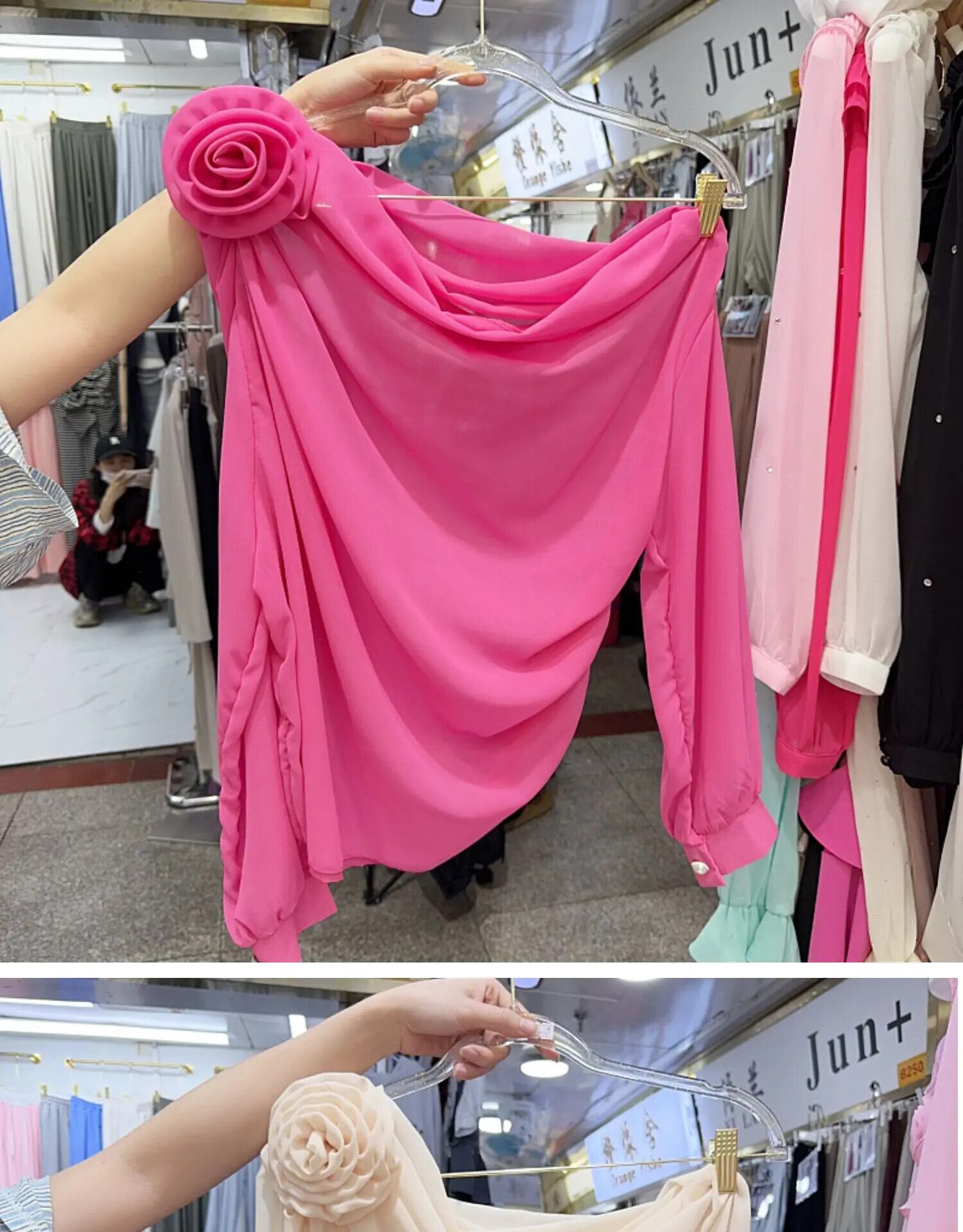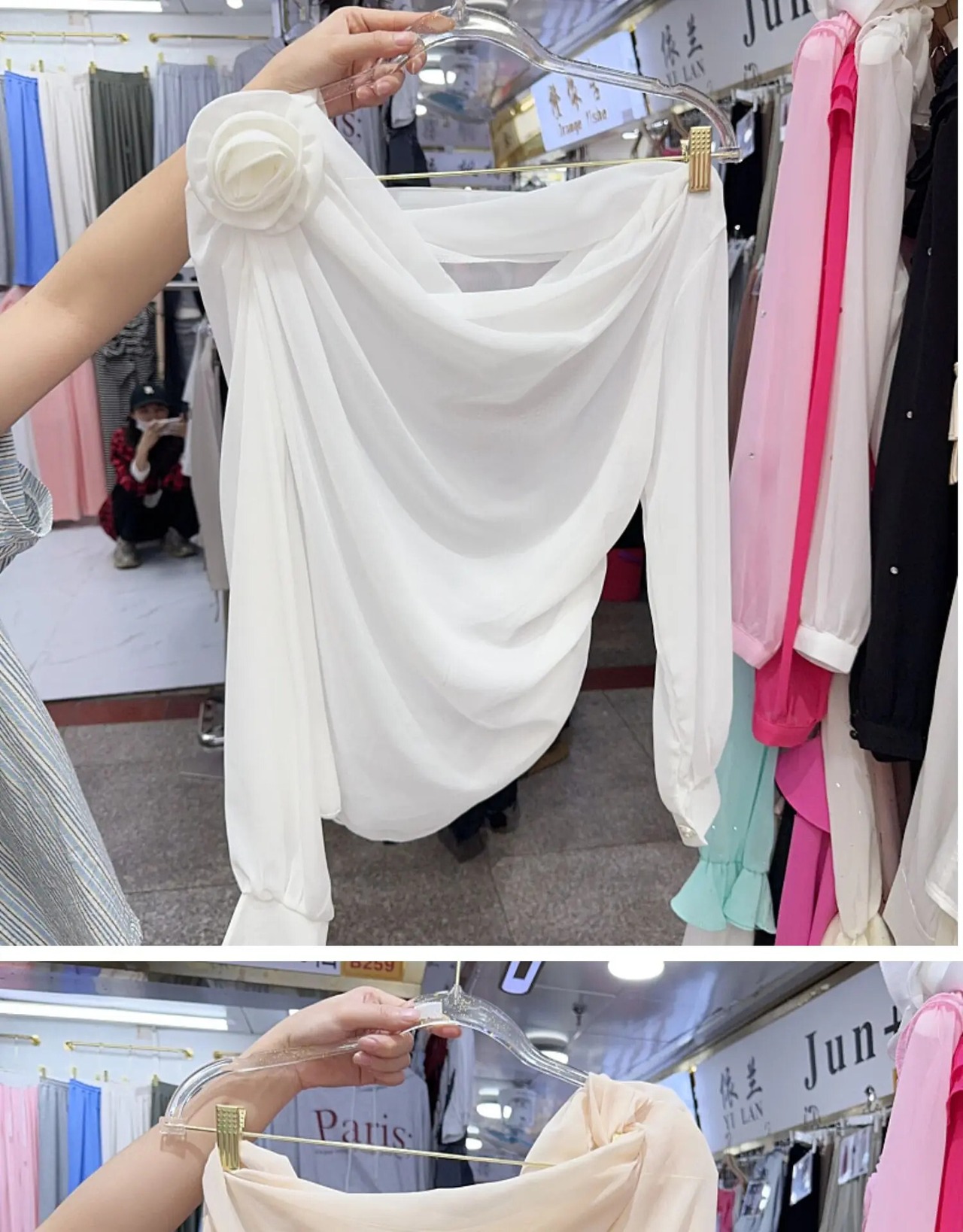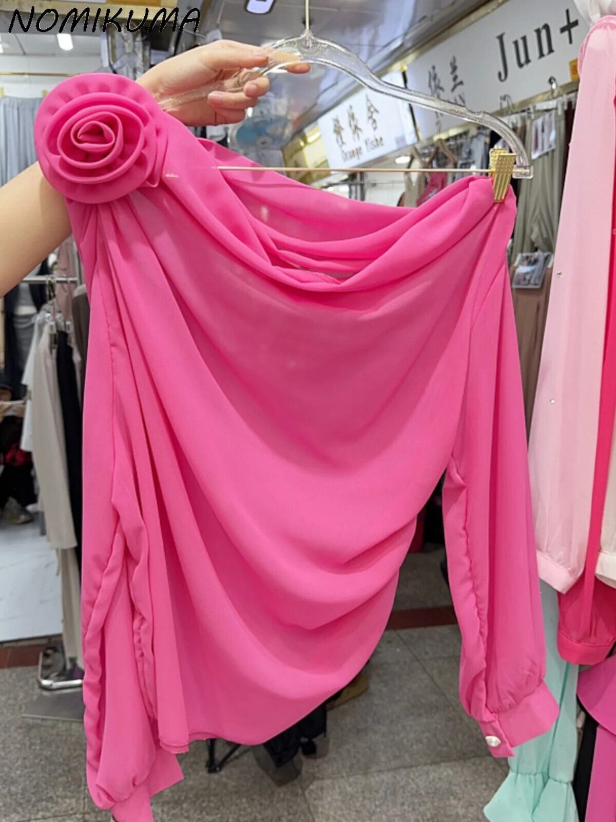 Nomikuma 長袖シフォンシャツ 2024 春ニッチオフショルダーフレンチスリムスタイル甘いスパイシートップ ロング 大人ガーリー スウィート キュート カジュアル スプリング 春物