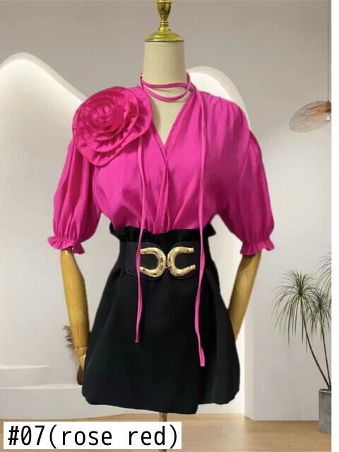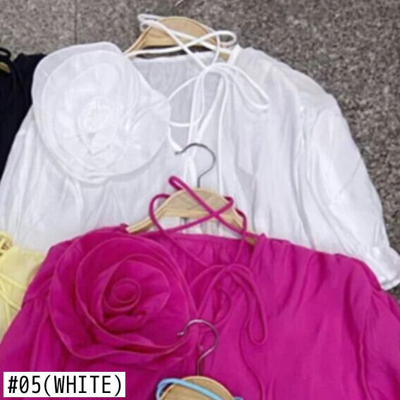 Nomikuma 2024 夏シック 3D フラワースプライシングパフスリーブ半袖シャツスタイル V ネックレディーストップス ショート ハーフスリーブ サマー 夏物 Vネック フラワーデザイン