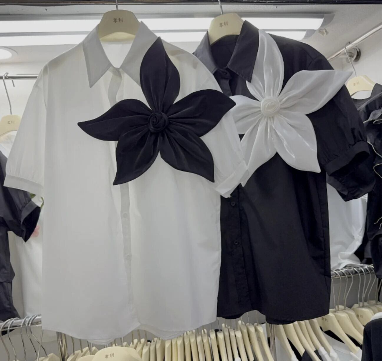 Nomikuma 2024 夏ターンダウン襟半袖レディーストップス 3D 花甘いブラウスシャツ ショート ハーフスリーブ 大人ガーリー スウィート キュート カジュアル サマー 夏物 フラワーデザイン
