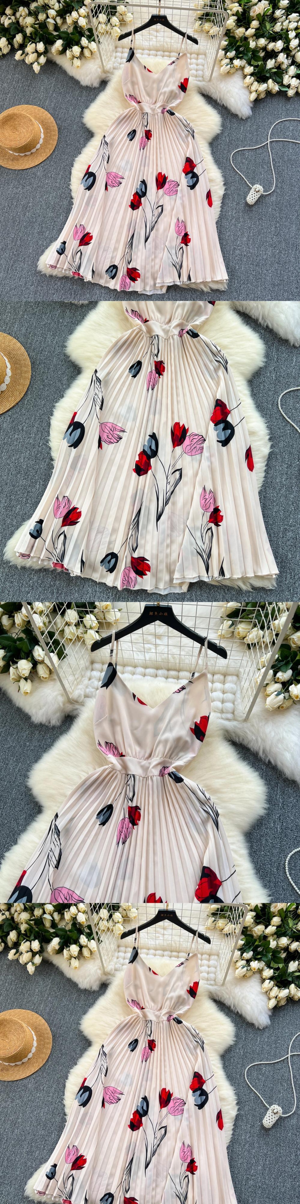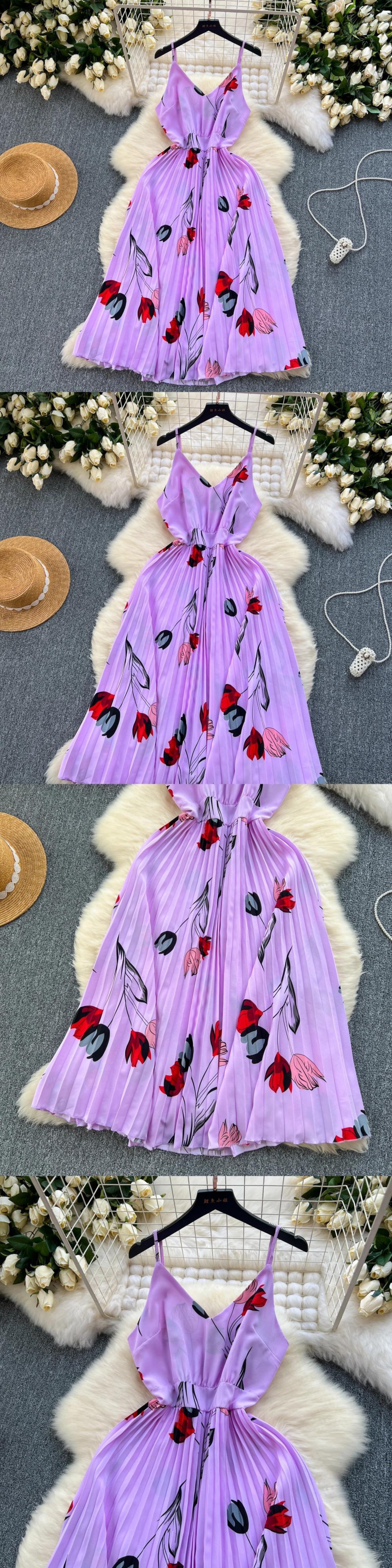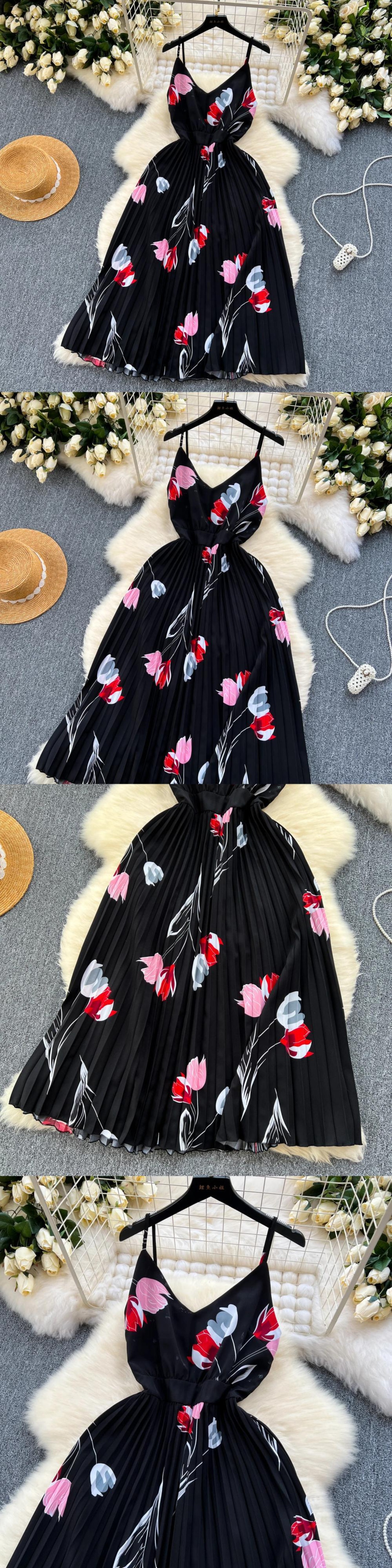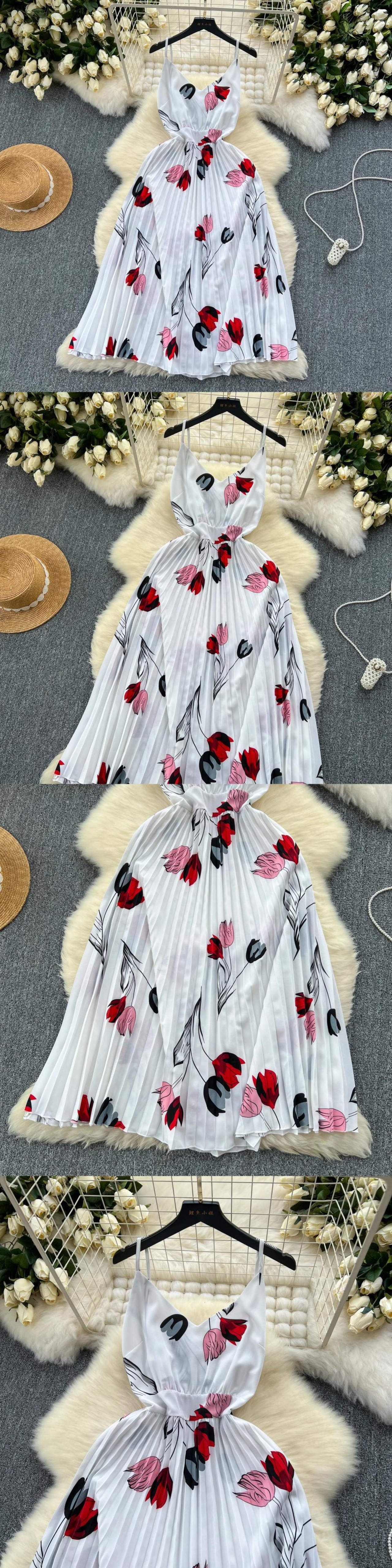 Nomikuma フレンチレトロ休暇スタイル不規則プリントミッドレングストラップドレス 2024 夏ビークロングドレス サマー 夏物