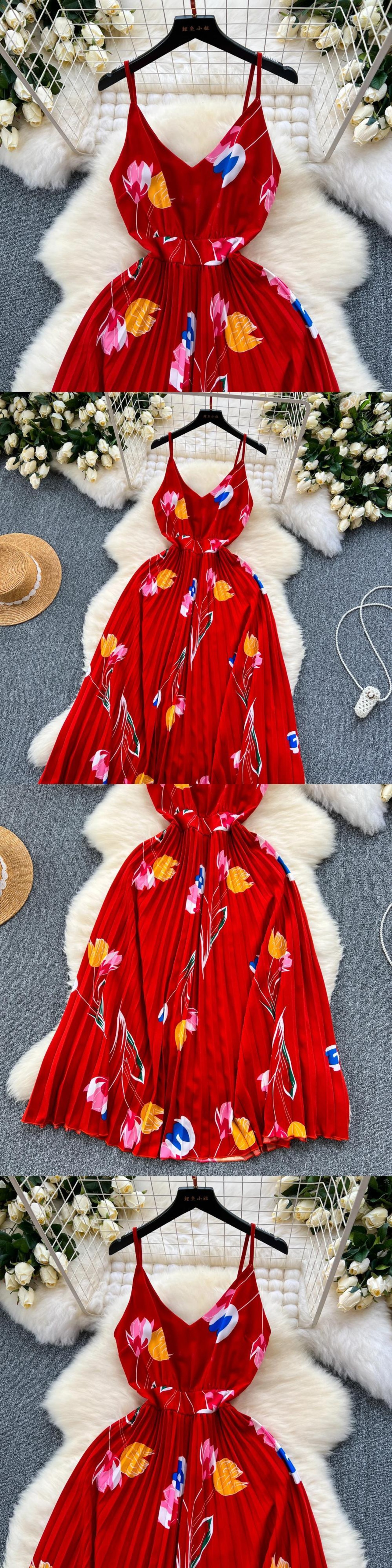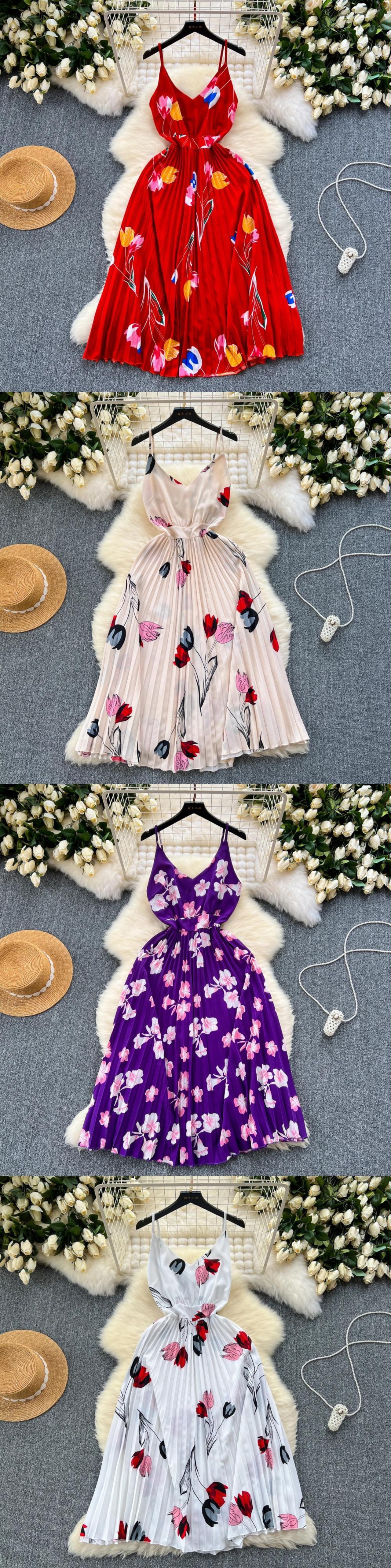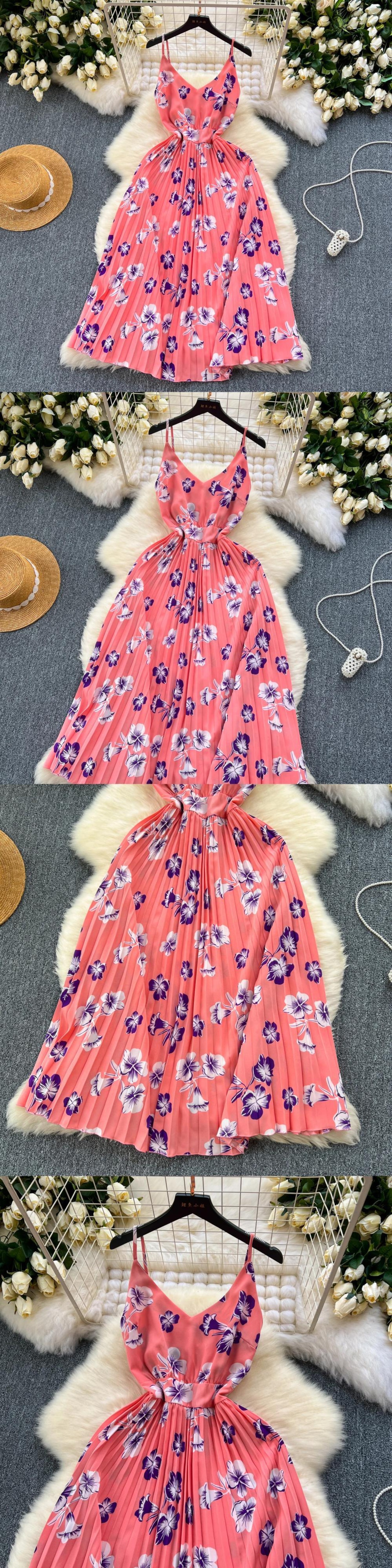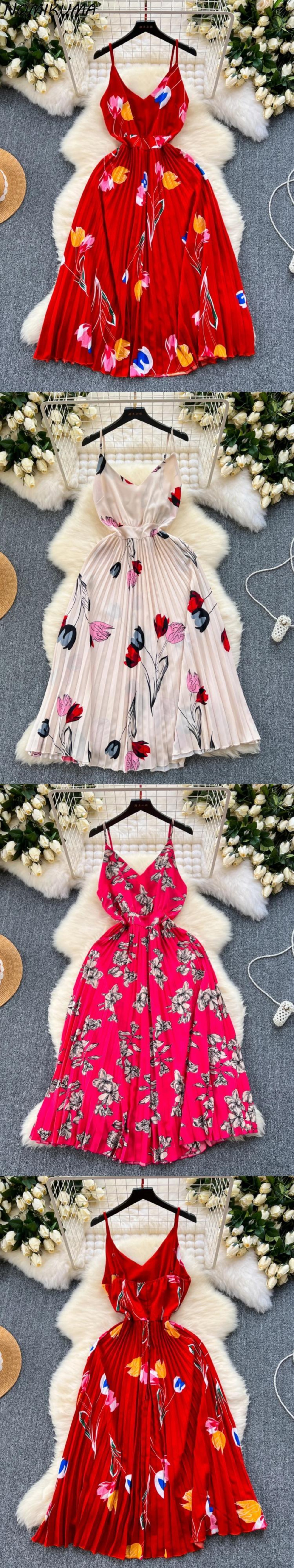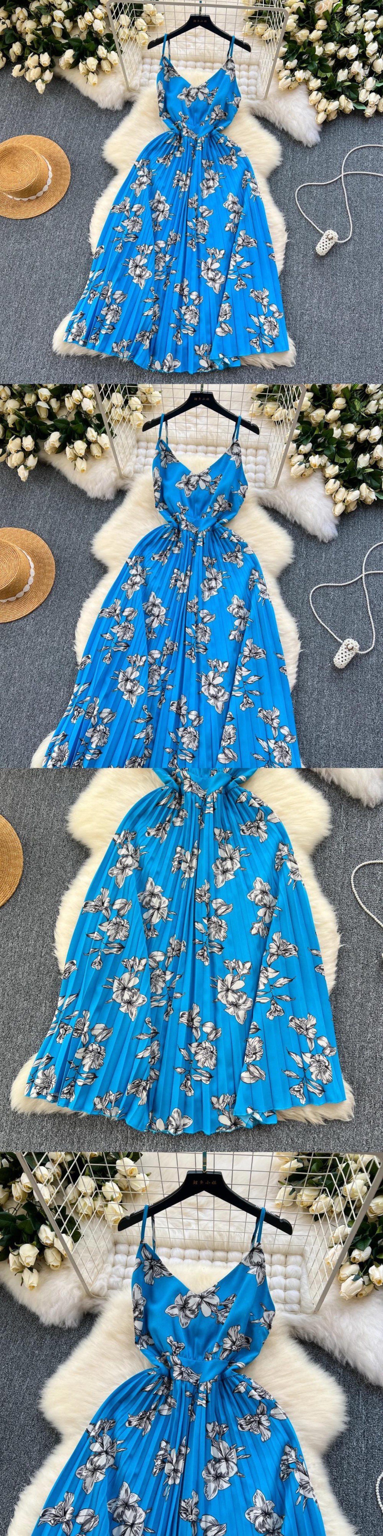 Nomikuma フレンチレトロ休暇スタイル不規則プリントミッドレングストラップドレス 2024 夏ビークロングドレス サマー 夏物
