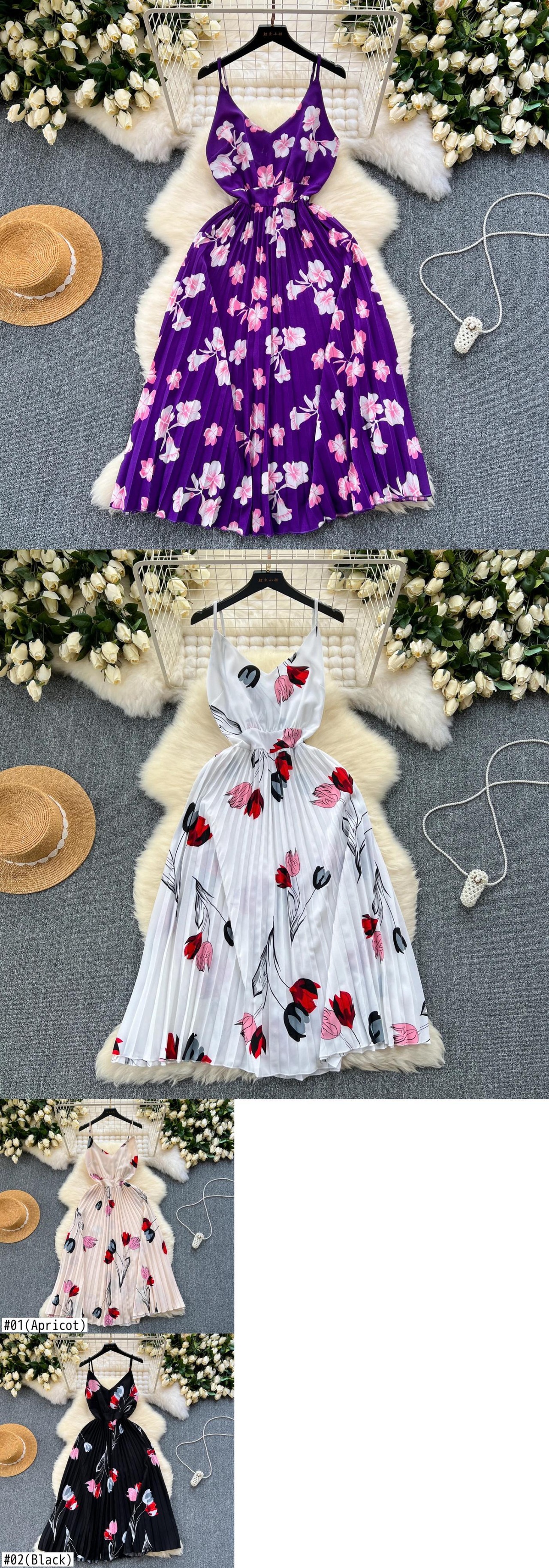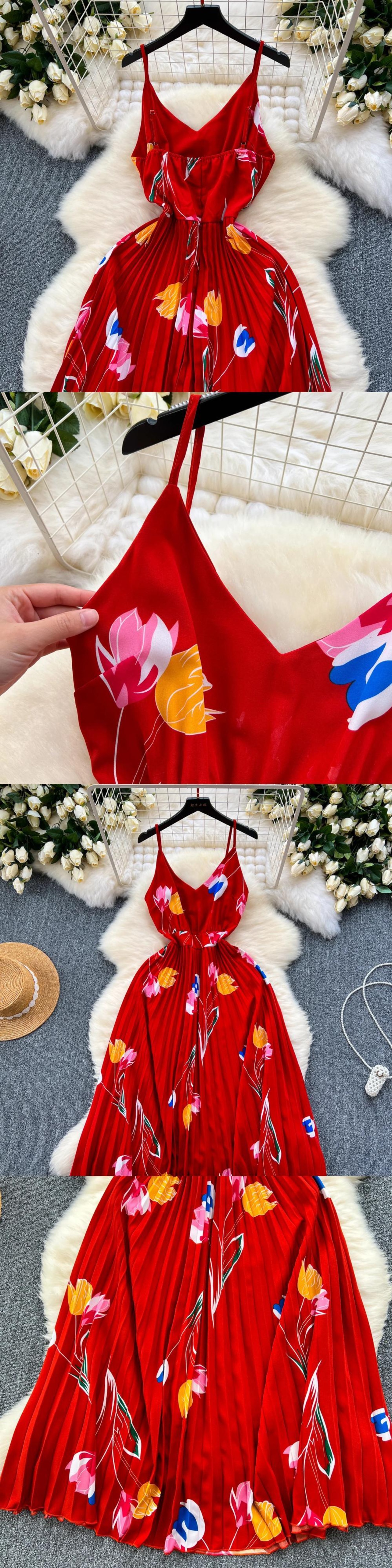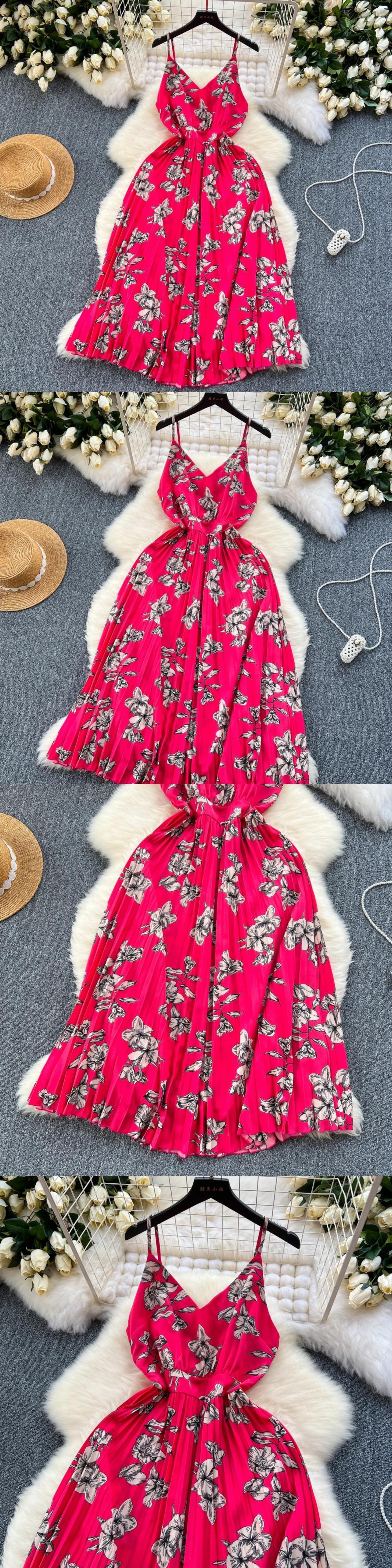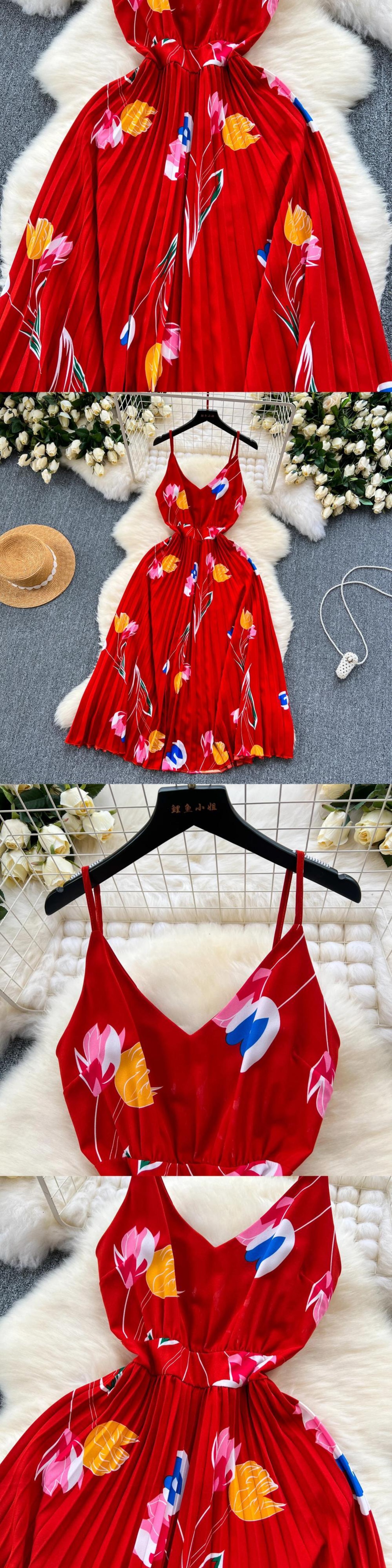 Nomikuma フレンチレトロ休暇スタイル不規則プリントミッドレングストラップドレス 2024 夏ビークロングドレス サマー 夏物