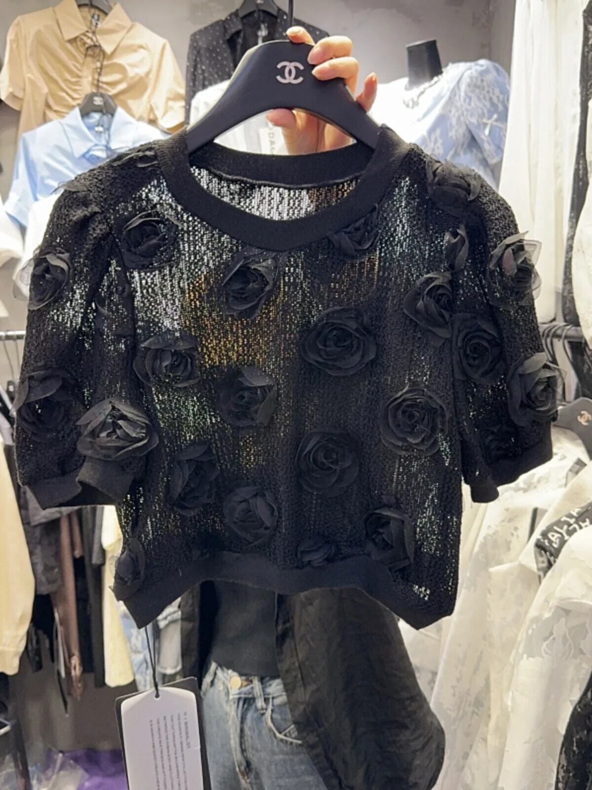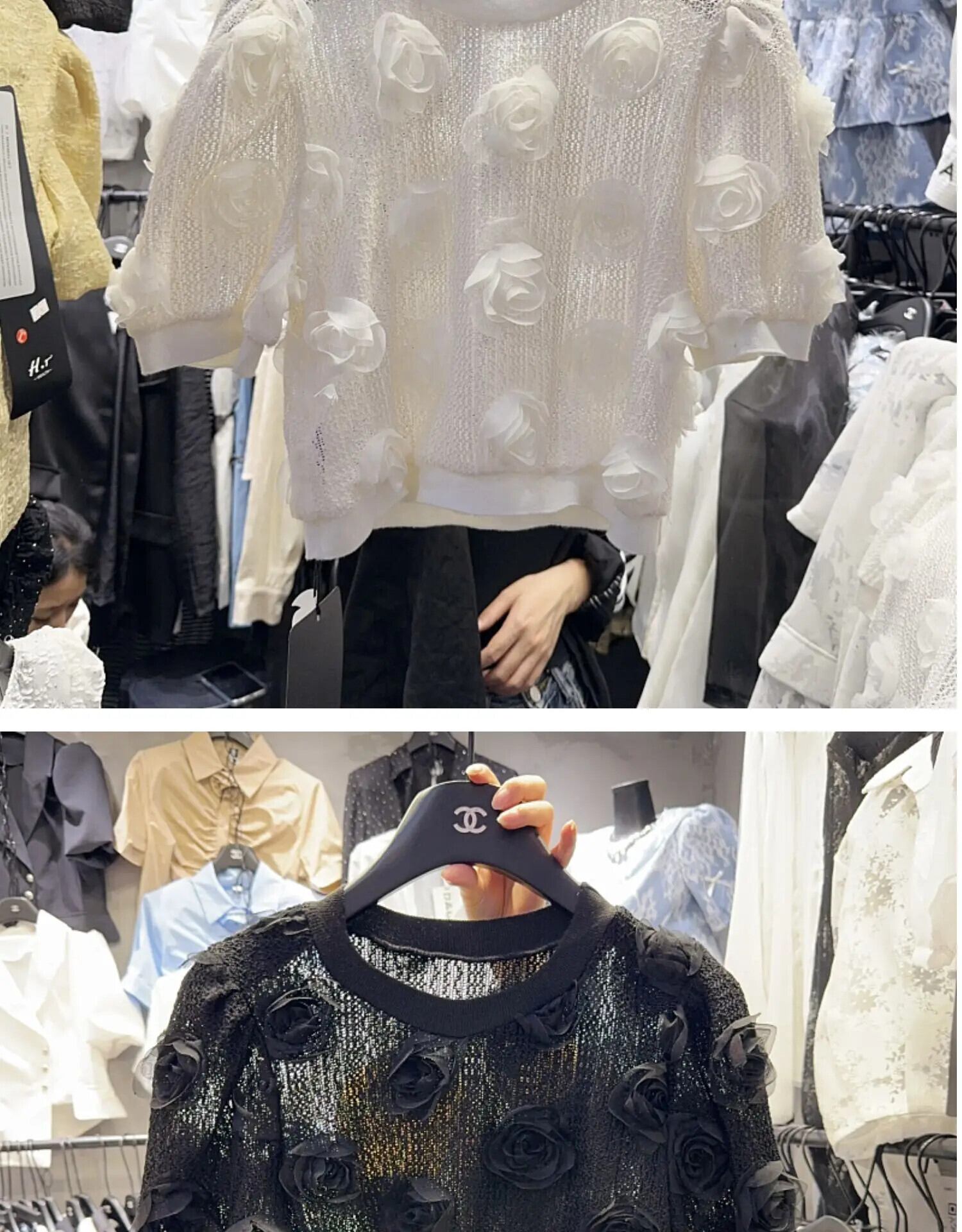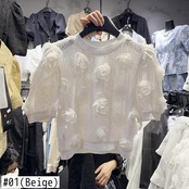 Nomikuma 3D ローズフラワーレースシャツフレンチラウンドネックパフ半袖トップ 2024 夏 ショート ハーフスリーブ サマー 夏物 Oネック フラワーデザイン