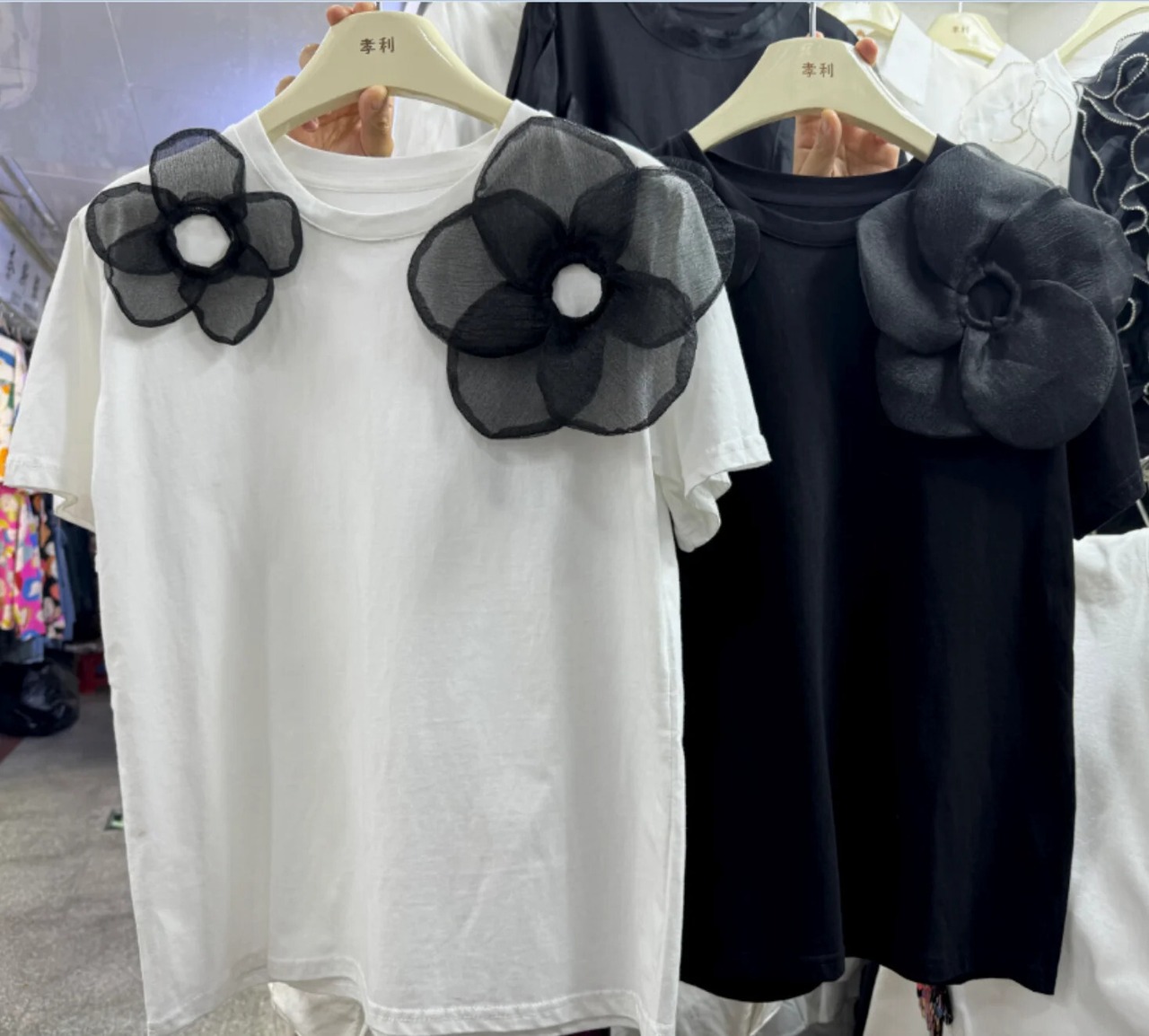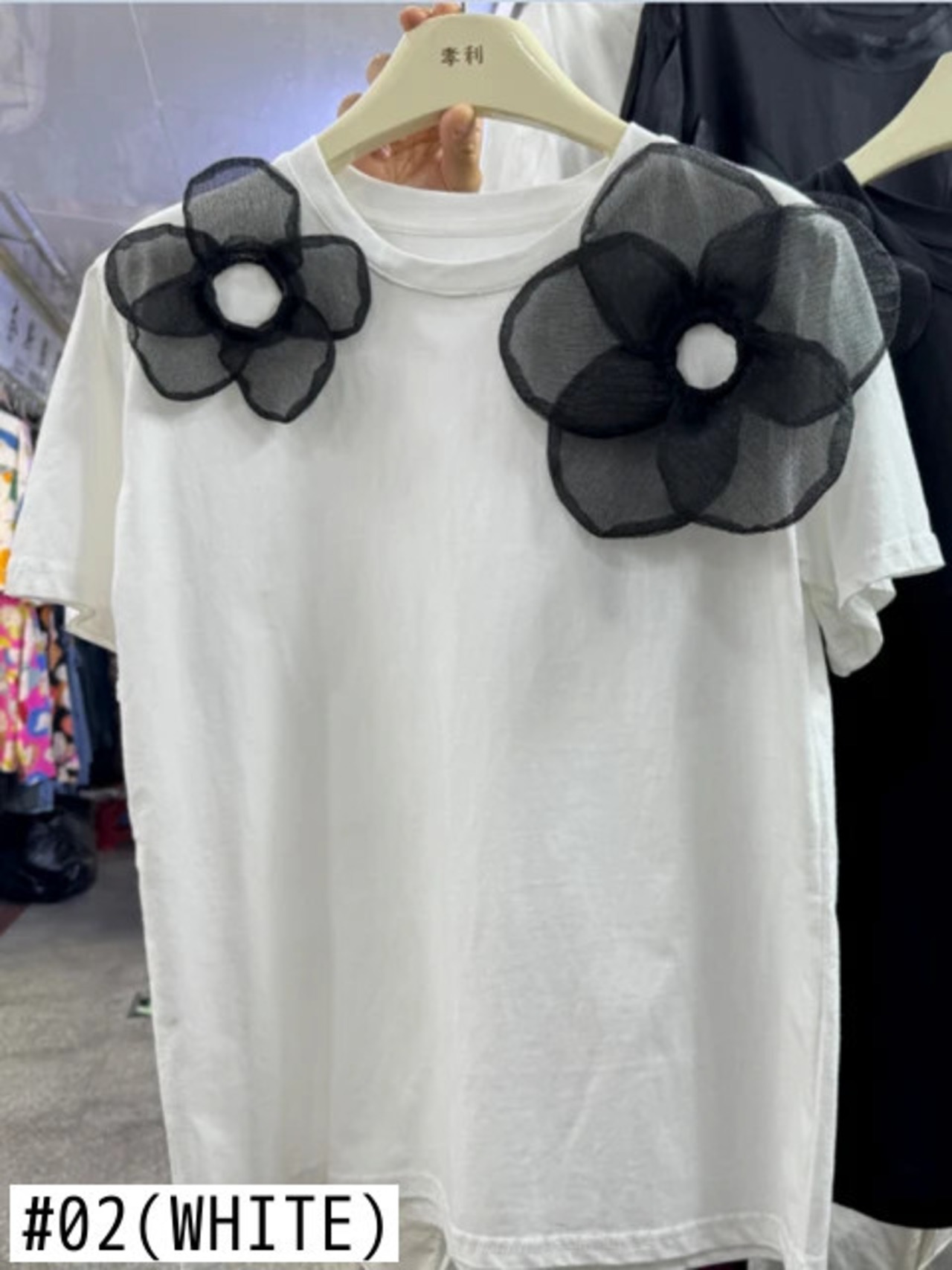 Nomikuma 2024 夏 Y2k トップ Tシャツ因果半袖 O ネックシック 3D フラワープルオーバー Tシャツ ショート ハーフスリーブ サマー 夏物 Oネック フラワーデザイン