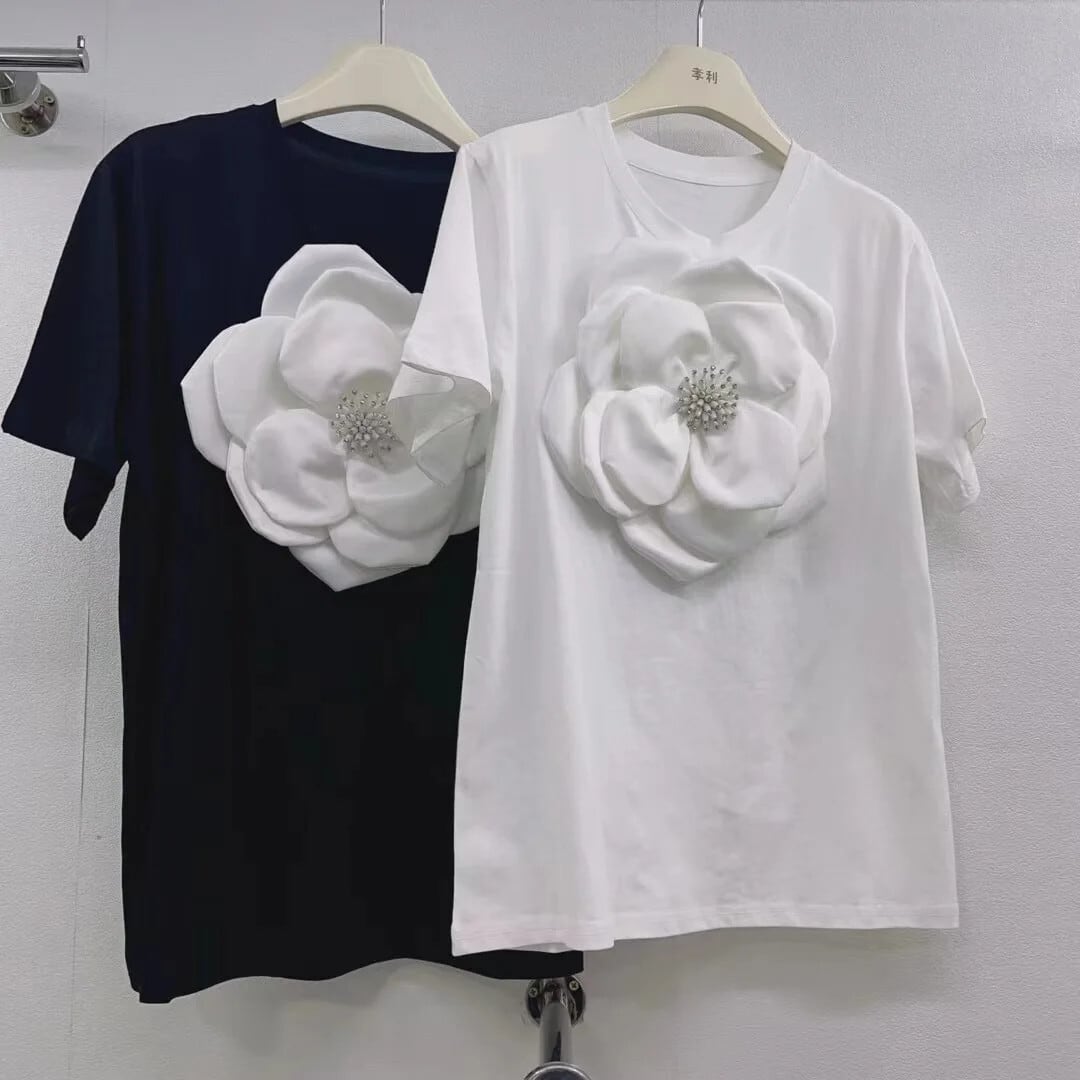 Nomikuma 2024 春夏ラウンドネック半袖 3D フラワー因果シック Tシャツ因果グラフィック Tシャツ ショート ハーフスリーブ スプリング 春物 サマー 夏物 Oネック フラワーデザイン