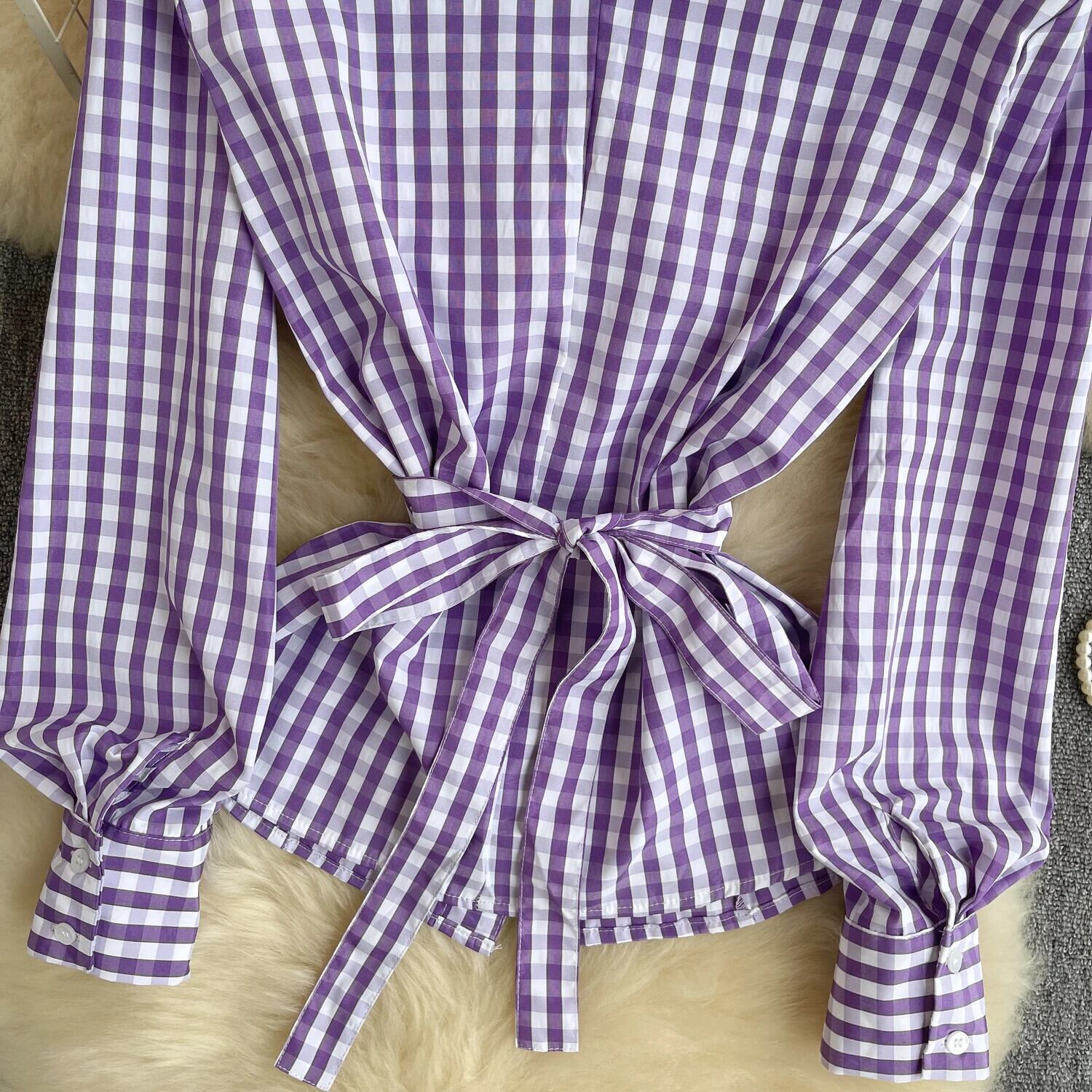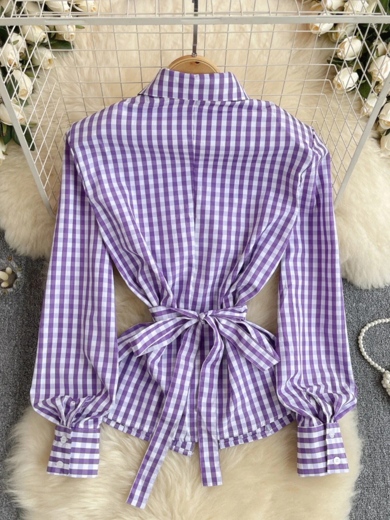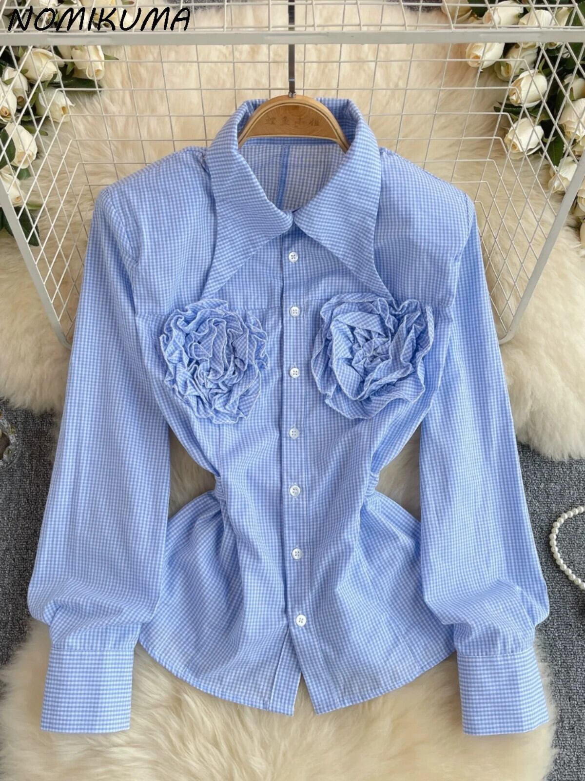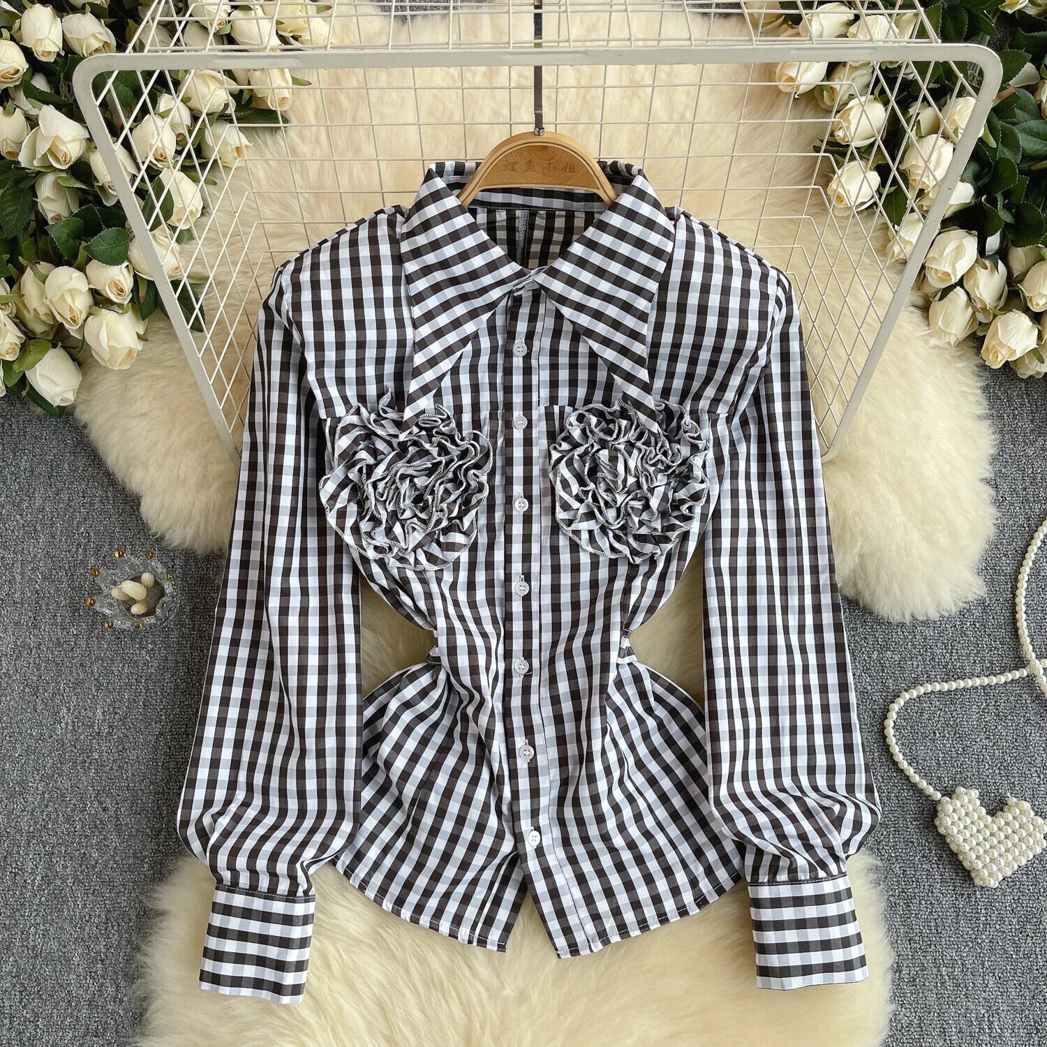 Nomikuma 春トップシック三次元フラワーネクタイストラップ痩身レトロチェック柄シャツ 2024 スプリング 春物 フラワーデザイン