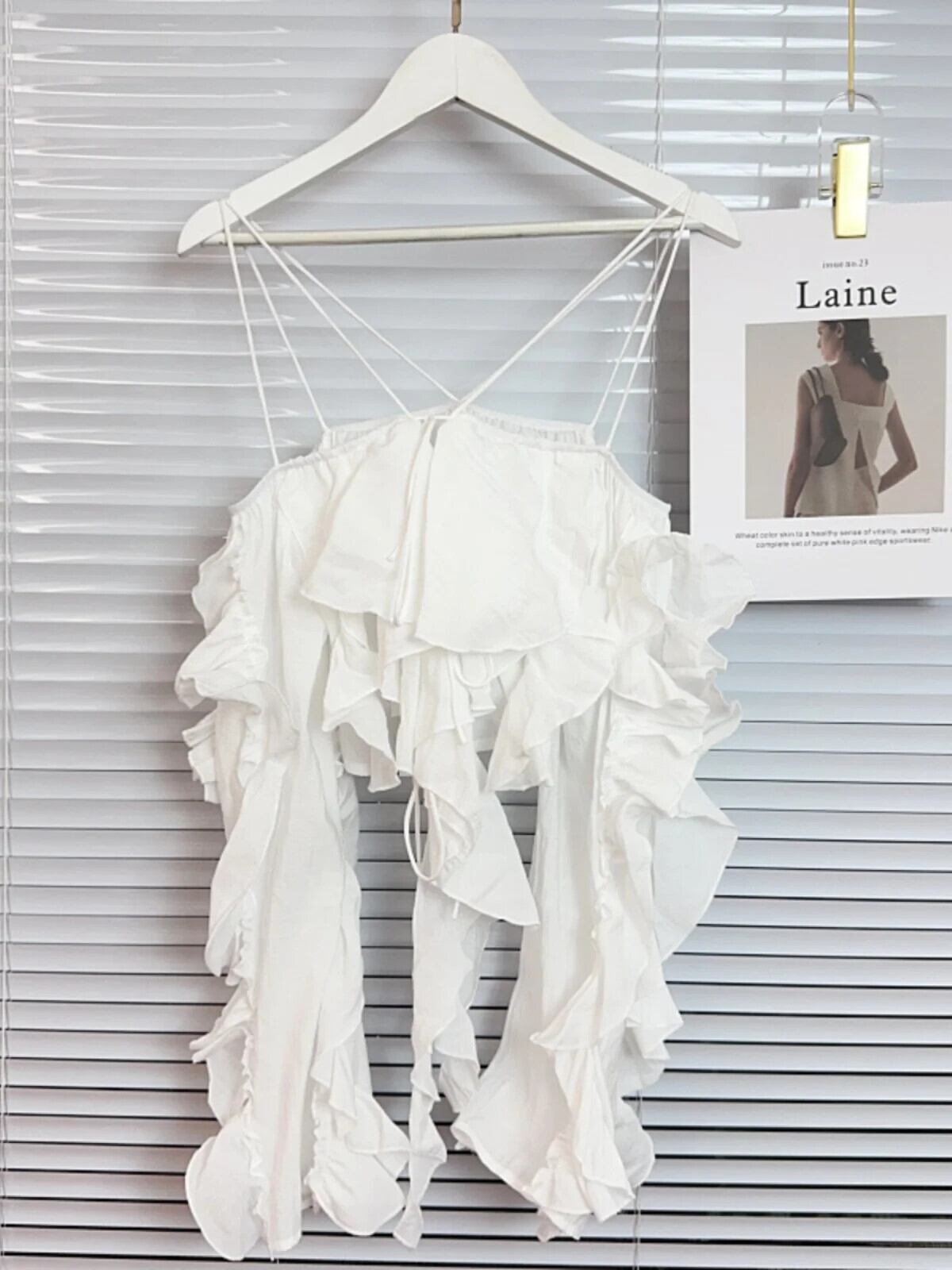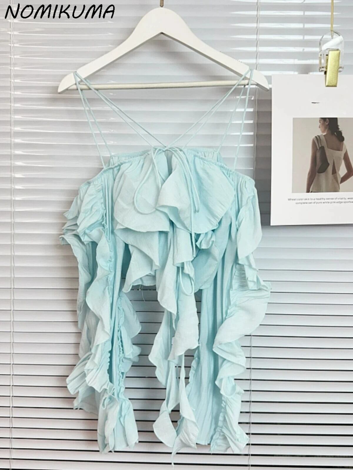 Nomikuma 2024 休暇スタイルハンギングネックプリーツフリルエッジ長袖シャツ夏セクシーオフショルダートップ ロング サマー 夏物
