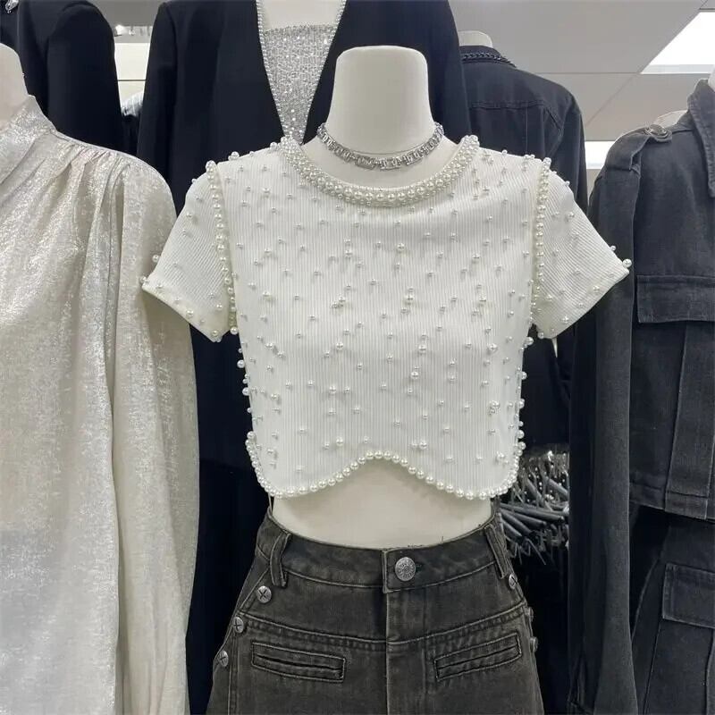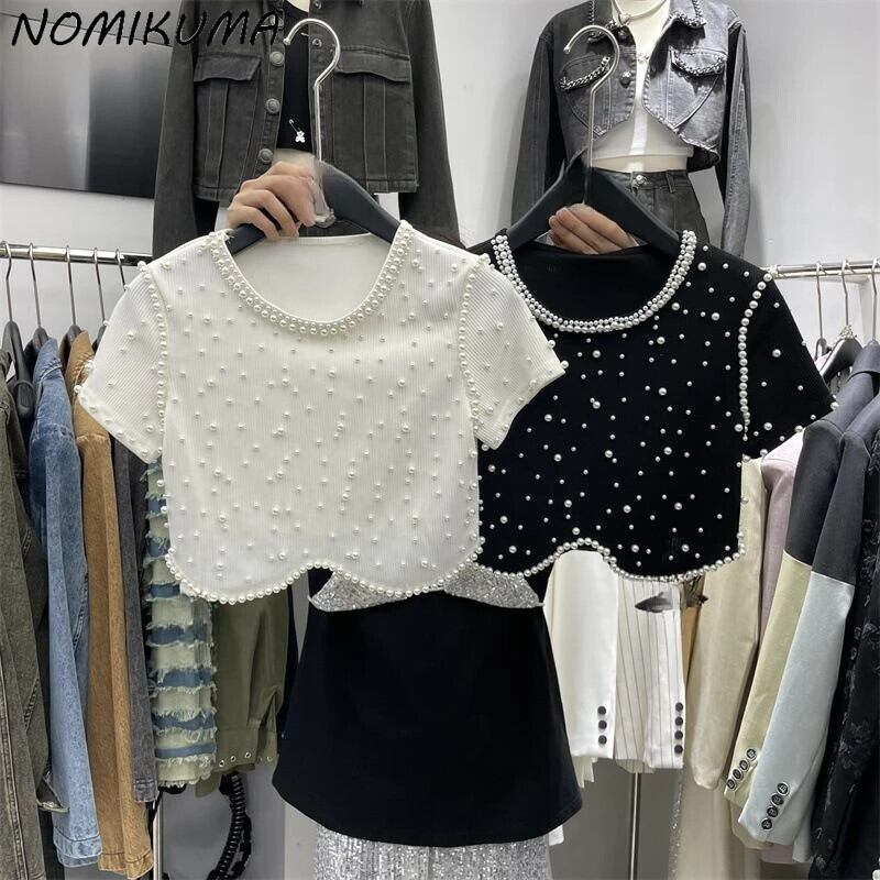 Nomikuma ビーズ ラウンドネック プルオーバー 半袖 スリムフィット ソリッドカラー Tシャツ レディース 因果 多用途 トップス ショート ハーフスリーブ Oネック