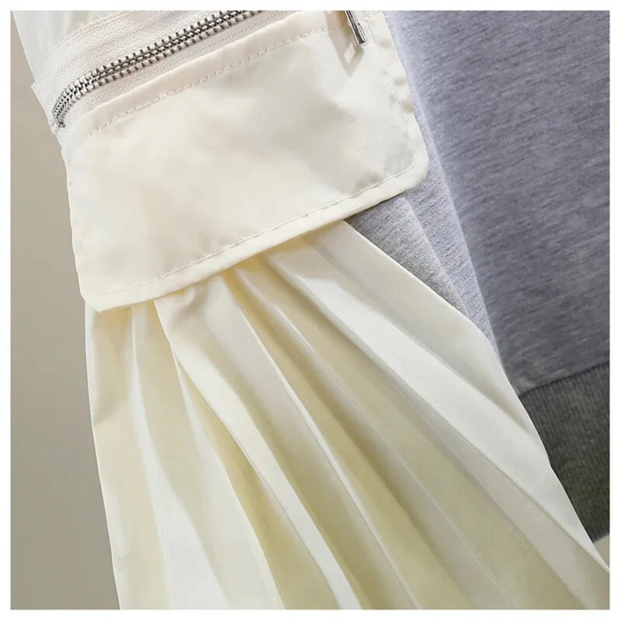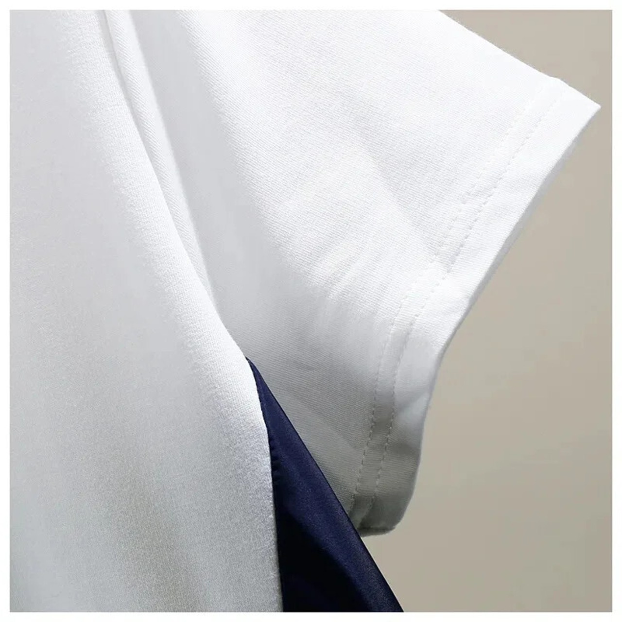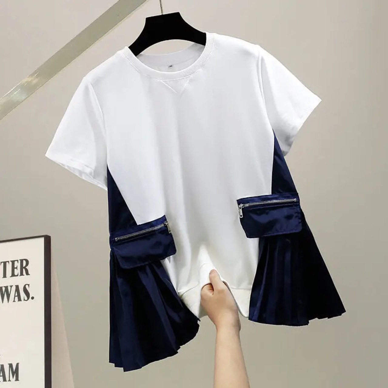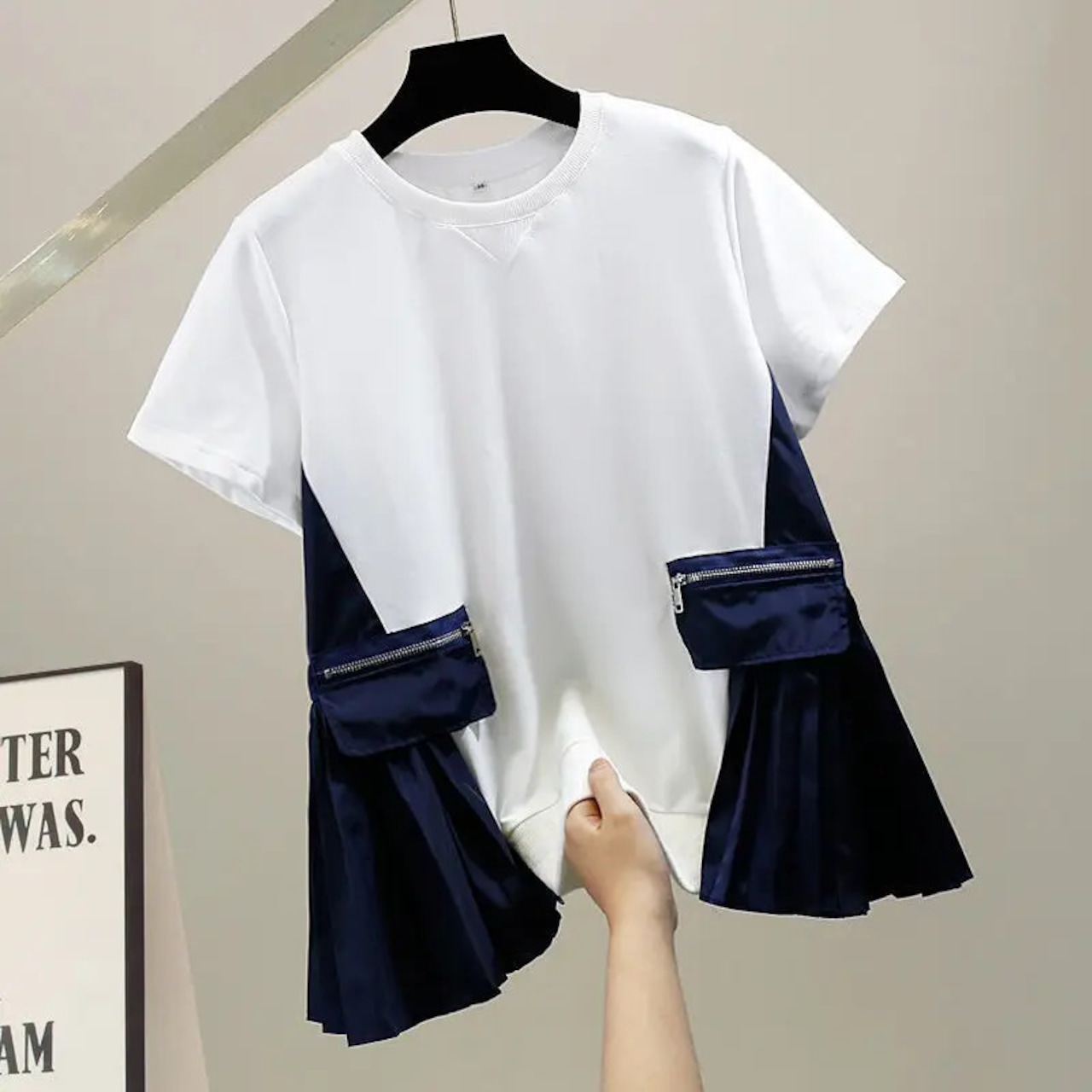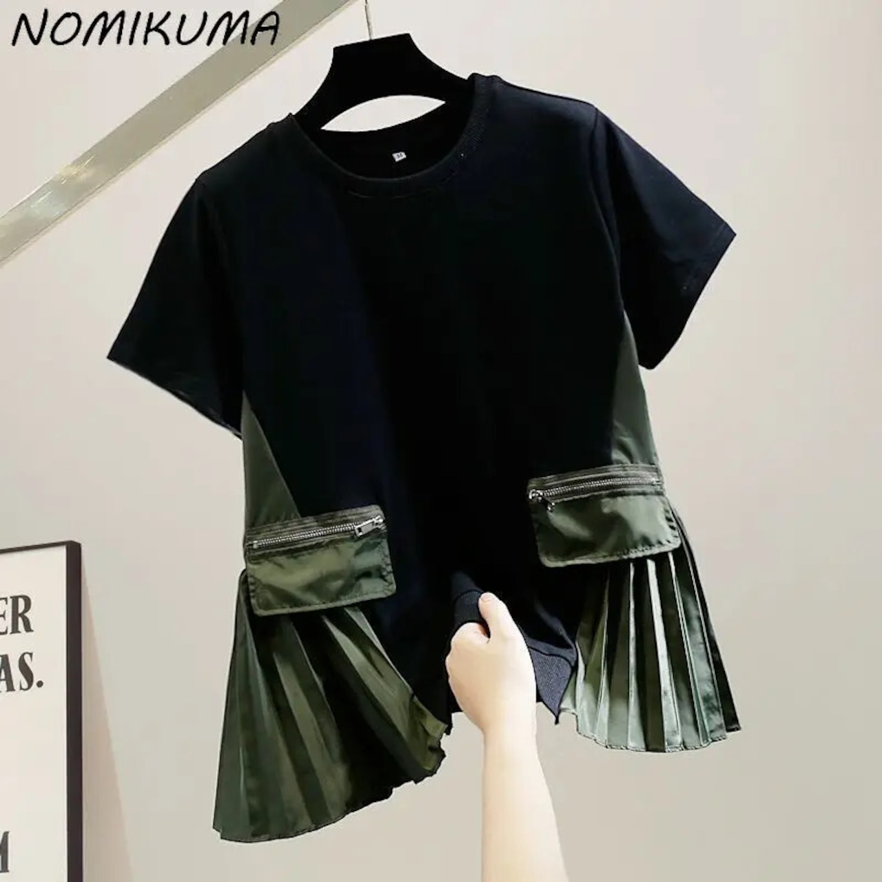 Nomikuma プリーツ裾コントラストカラーパッチワークフェイクポケット半袖 Tシャツカジュアルレディーストップス ショート ハーフスリーブ
