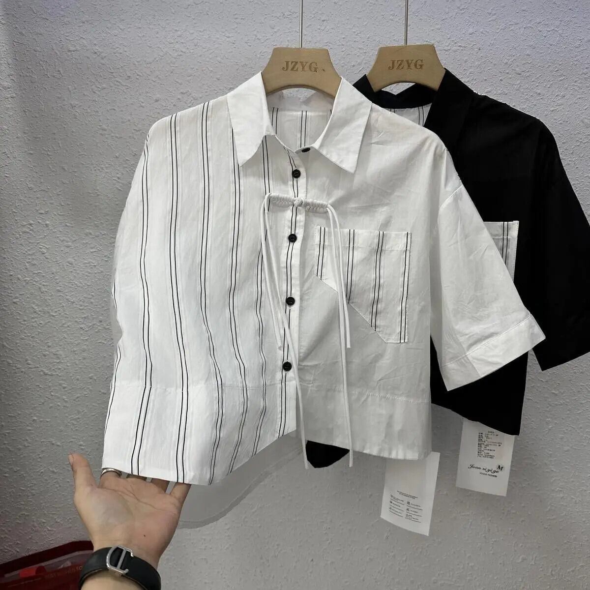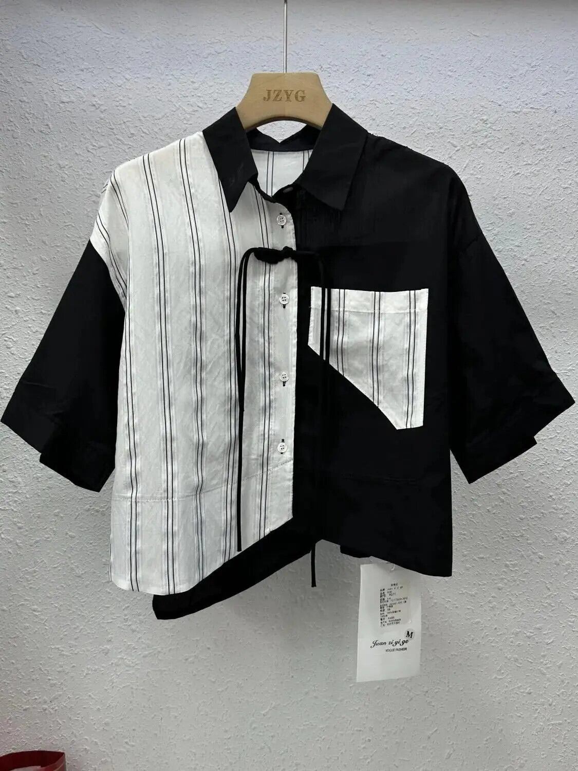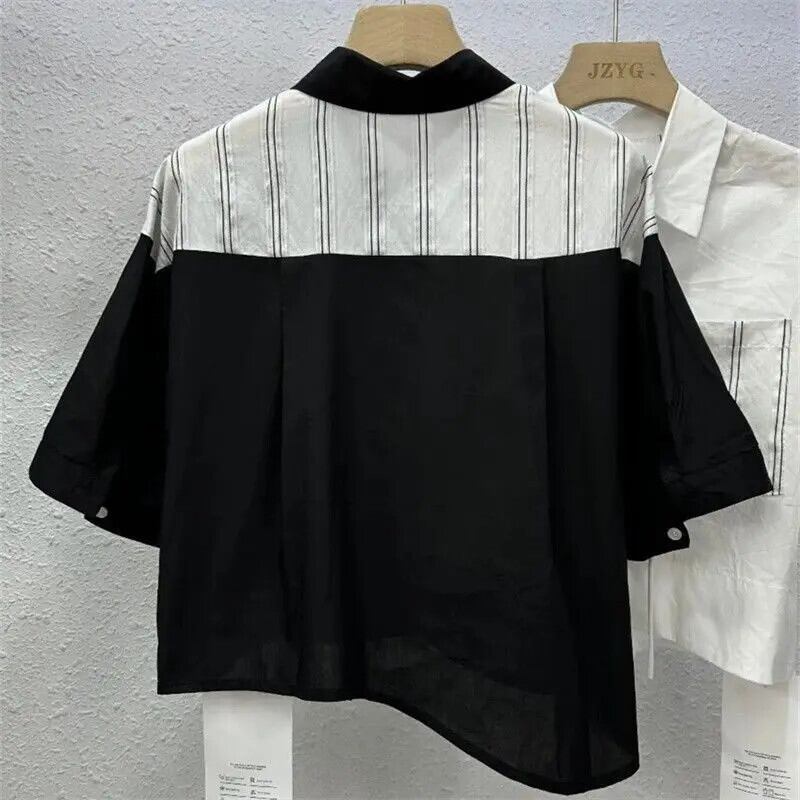Nomikuma 2024 ニッチ半袖シャツコントラストカラーストライプパッチワークブラウストップカミーサ ショート ハーフスリーブ