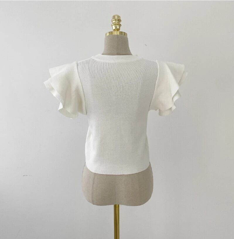 Nomikuma シック夏ラウンドネックパッチワークシック二層フリルエッジ多用途スリミングフライングスリーブニットシャツ サマー 夏物 Oネック