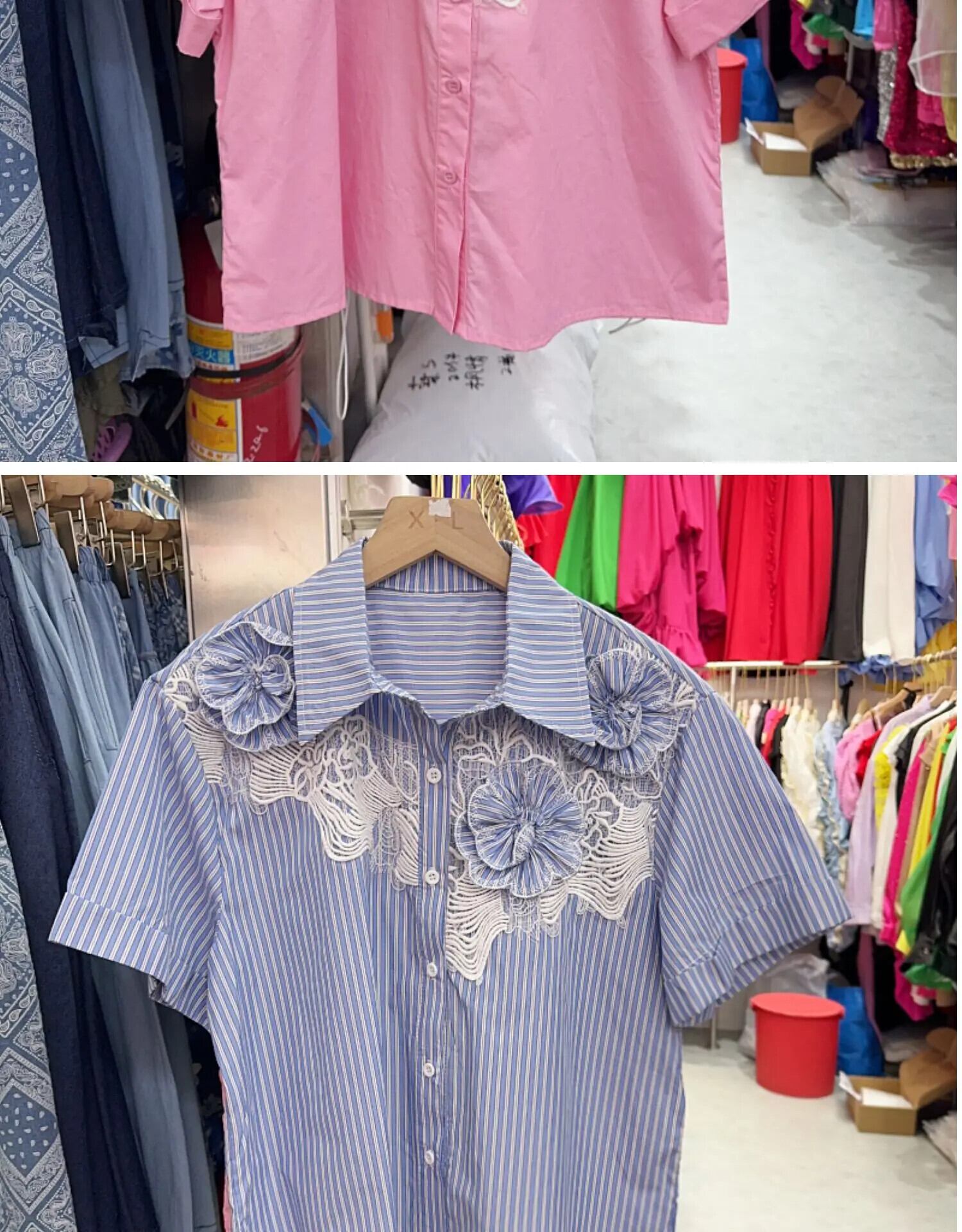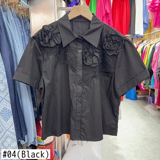 Nomikuma 刺繍レース立体フラワーシャツニッチ 2024 夏半袖フレンチトップ ショート レッド ハーフスリーブ サマー 夏物 フラワーデザイン
