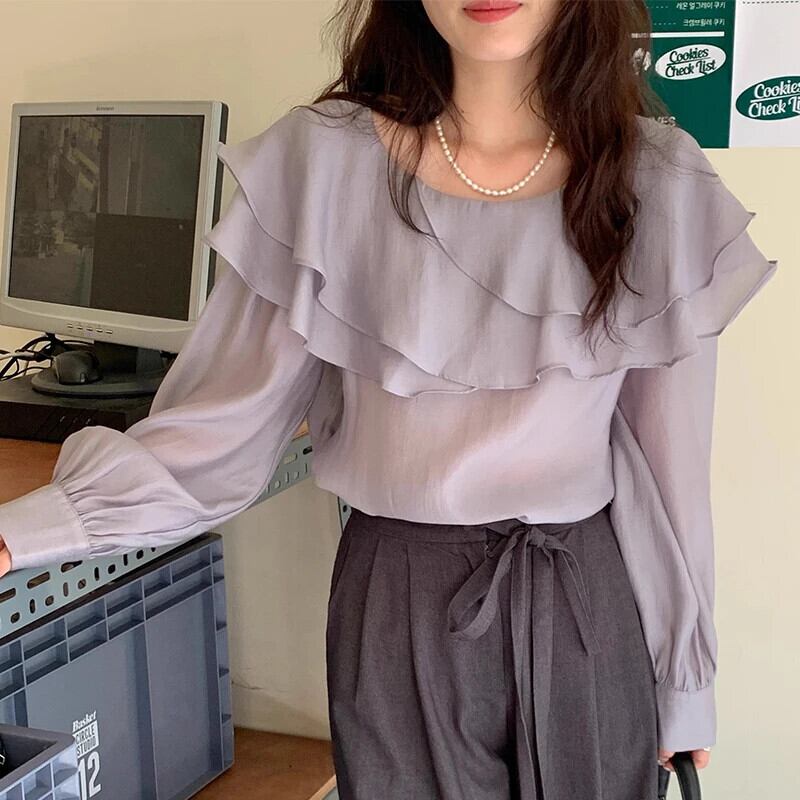 Nomikuma シック春ラウンドネックパッチワークフリルエッジ薄手カジュアル万能長袖シャツレディース ロング スプリング 春物 Oネック