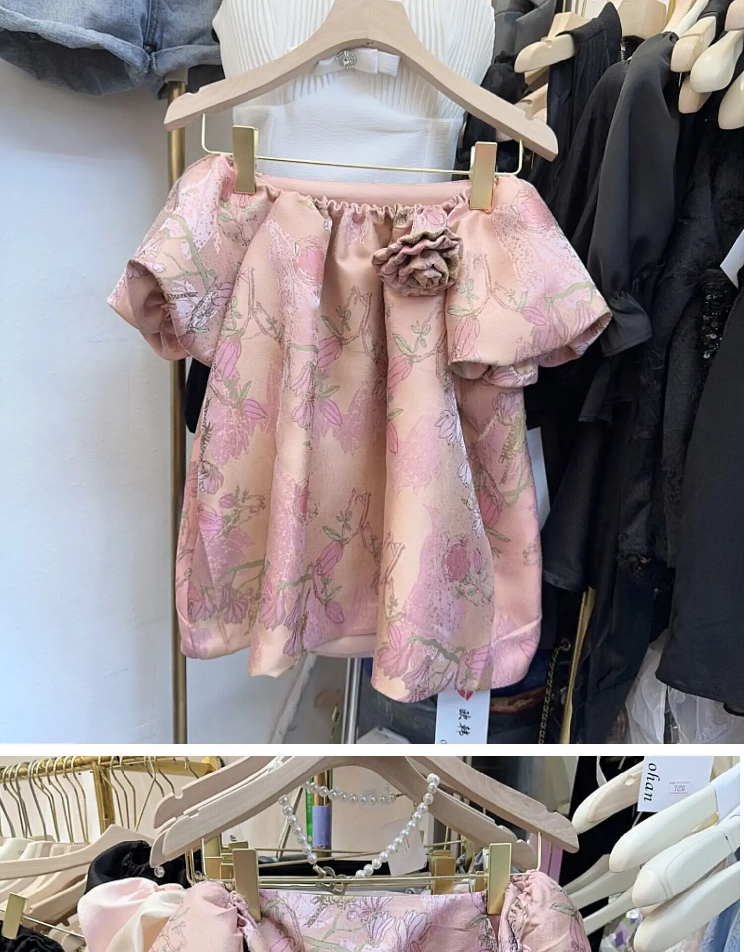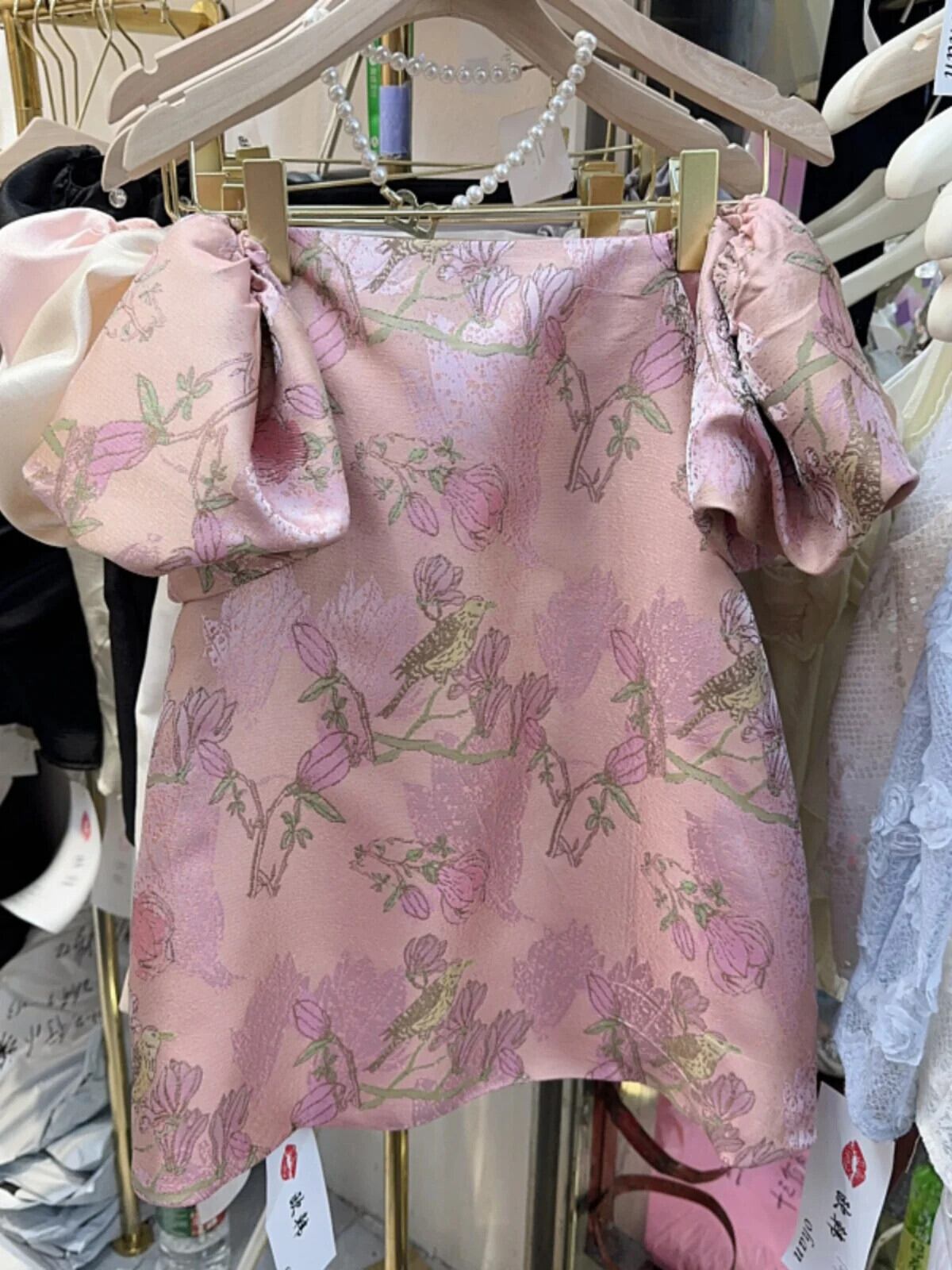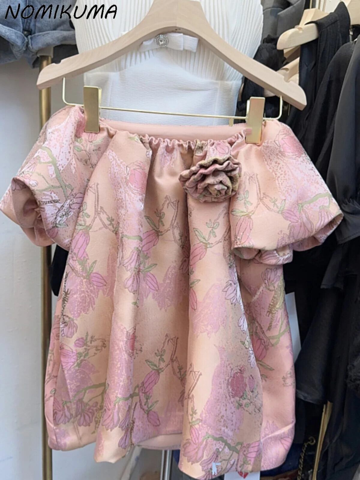 Nomikuma レトロ ジャカード パフ スリーブ オフショルダー シャツ レディース 夏 シック トップ カジュアル ブラウス サマー 夏物