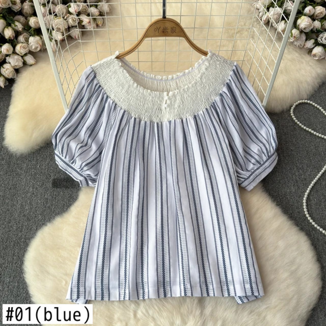 Nomikuma 夏通勤ストライプ半袖トップスリムラウンドネックレトロアカデミースタイルシャツ 2024 ブラウス ショート ハーフスリーブ サマー 夏物 Oネック