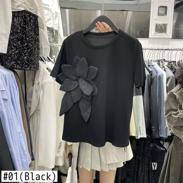 [ノミクマ] ビーズ立体フラワー半袖Tシャツ レディース 2024春夏 トップス ショート ハーフスリーブ スプリング 春物 サマー 夏物 フラワーデザイン