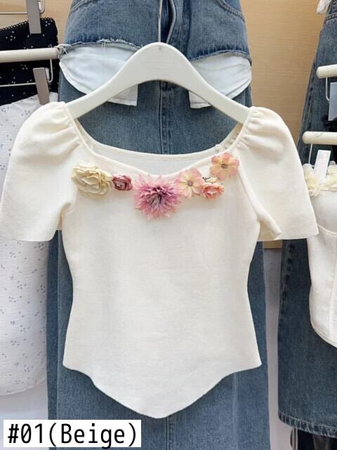 Nomikuma パフスリーブ立体フラワー V ネック半袖 Tシャツ夏ウエスト痩身スパイシーガールニッチ Y2k トップ ショート ハーフスリーブ サマー 夏物 Vネック フラワーデザイン