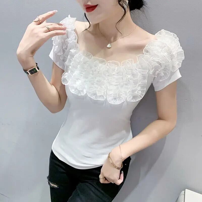 Nomikuma 2024 夏オフショルダーシックプリーツフリルパッチワーク Tシャツトップ半袖シックトップシャツ ショート ハーフスリーブ サマー 夏物