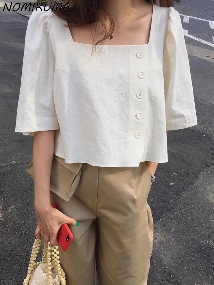 Nomikuma シック夏スクエアネックサイドシングルブレスト多用途リネンショートパフスリーブシャツ サマー 夏物 スクウェア