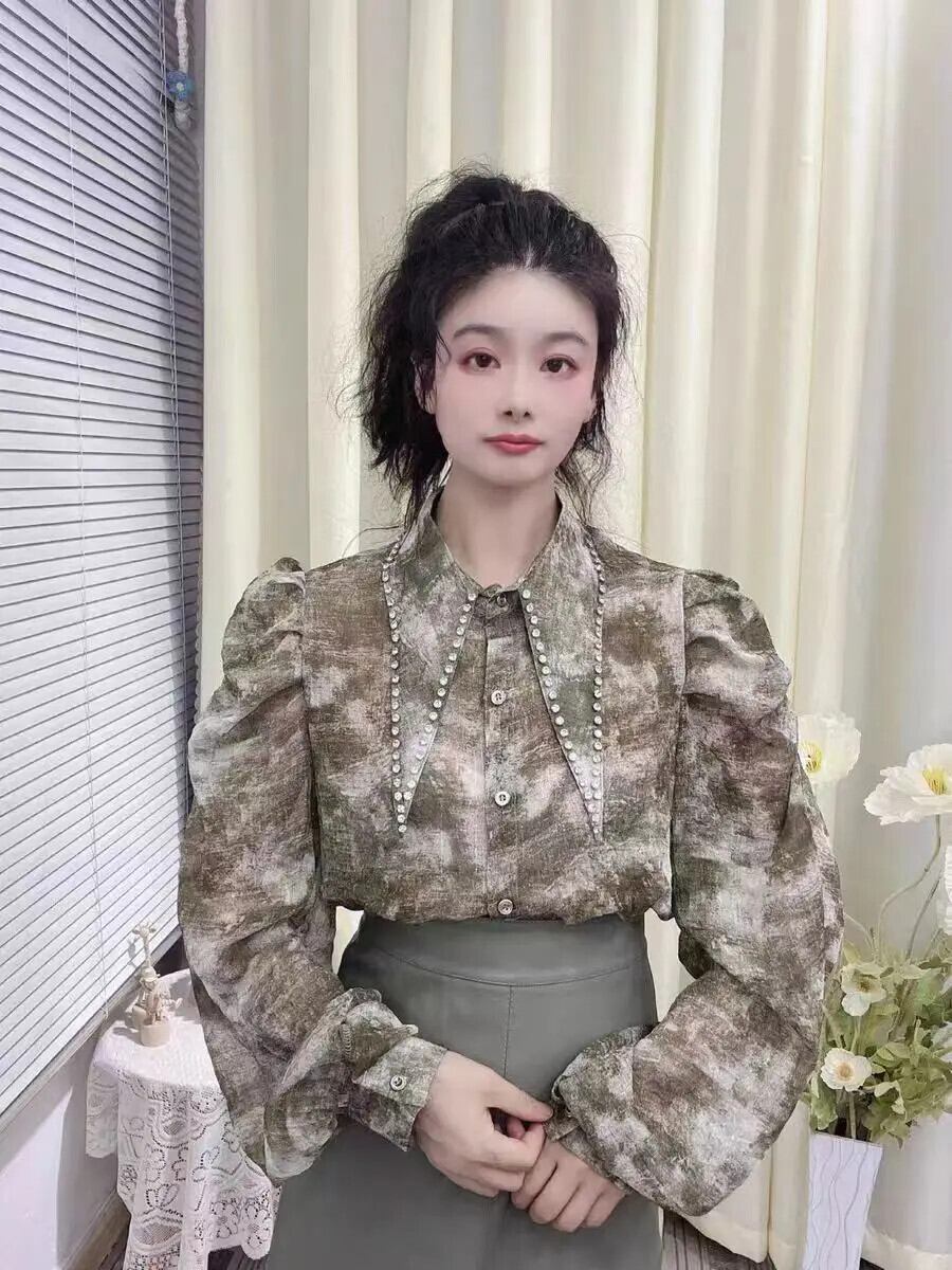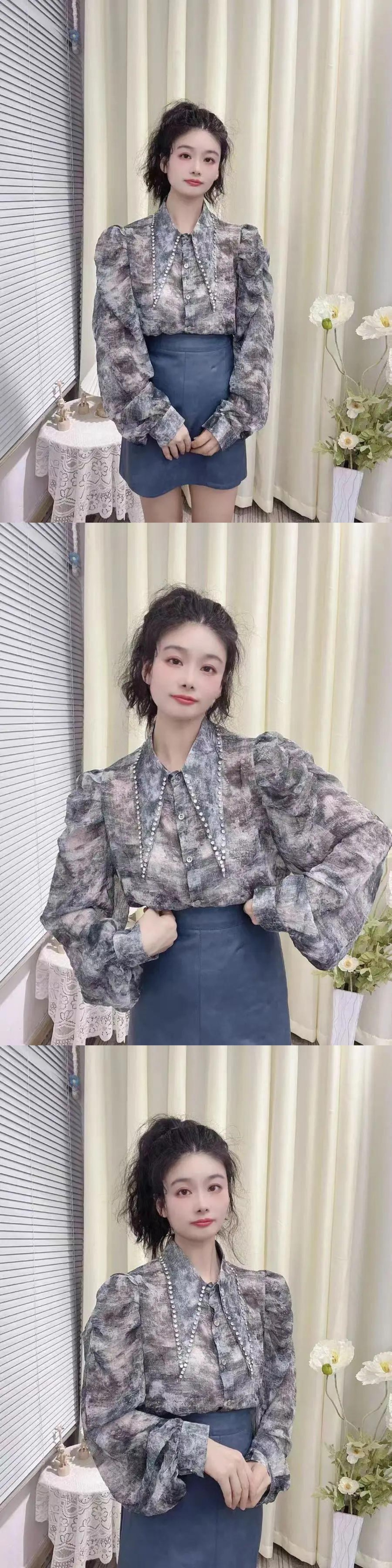 Nomikuma 2024 春 シフォンシャツ レディース パフスリーブ トップス ダイヤモンド ターンダウンカラー ブラウス カミーサ スプリング 春物