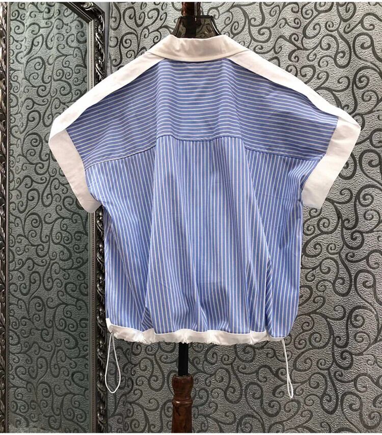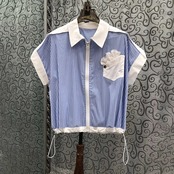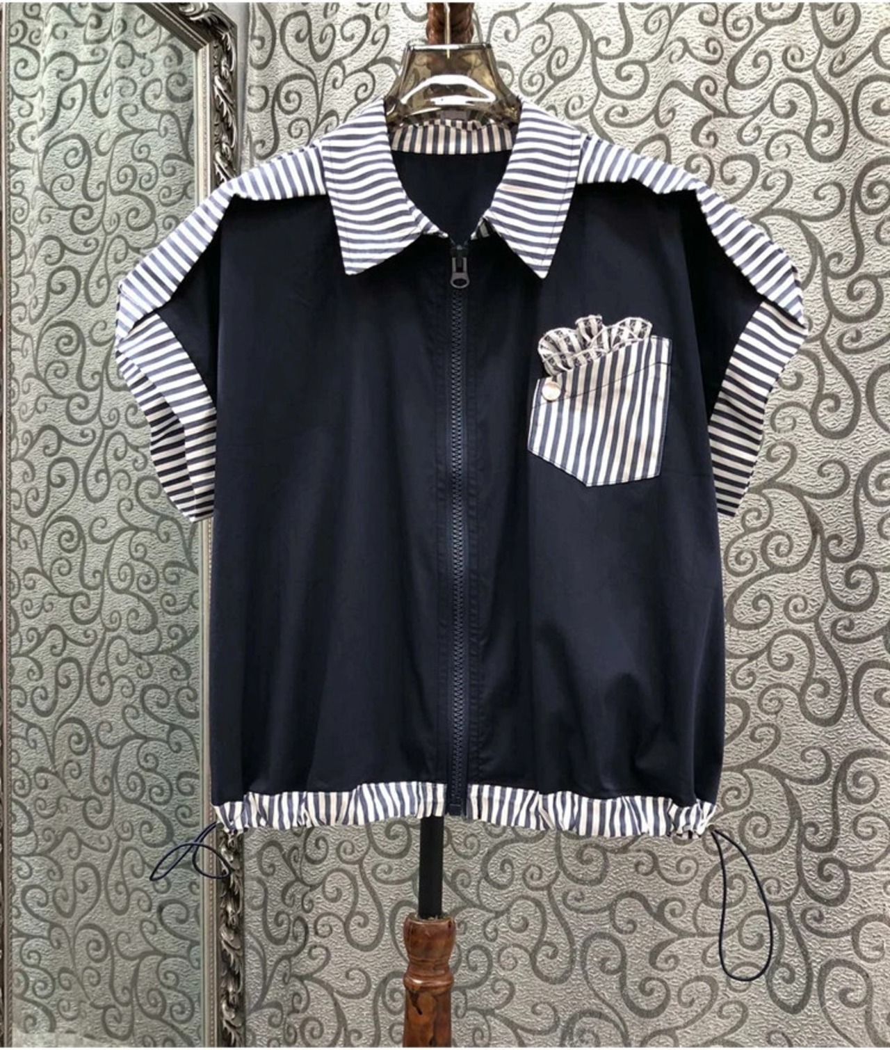Nomikuma フレンチストライプパッチワークレースポケットジッパー半袖シャツレディース 2024 夏ニッチトップ ショート レッド ハーフスリーブ サマー 夏物
