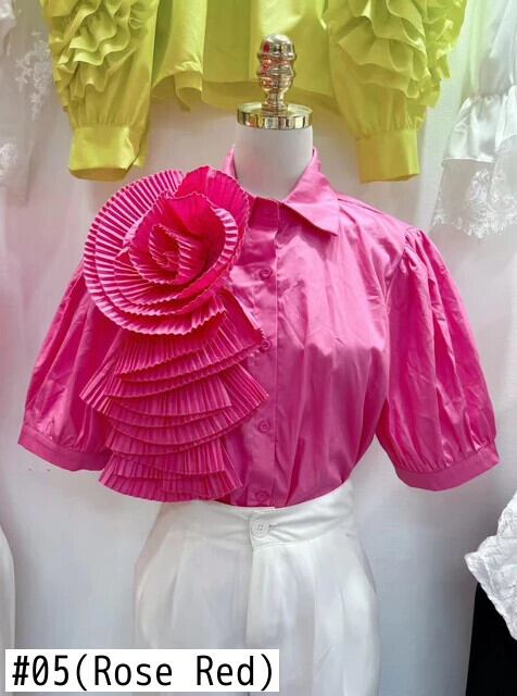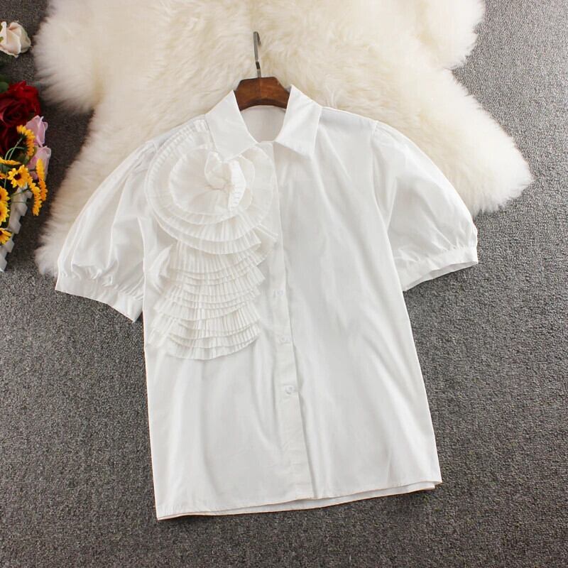 Nomikuma 夏半袖甘いプリーツ木耳エッジパッチワーク立体フラワーシャツトップ ショート ハーフスリーブ 大人ガーリー スウィート キュート カジュアル サマー 夏物 フラワーデザイン