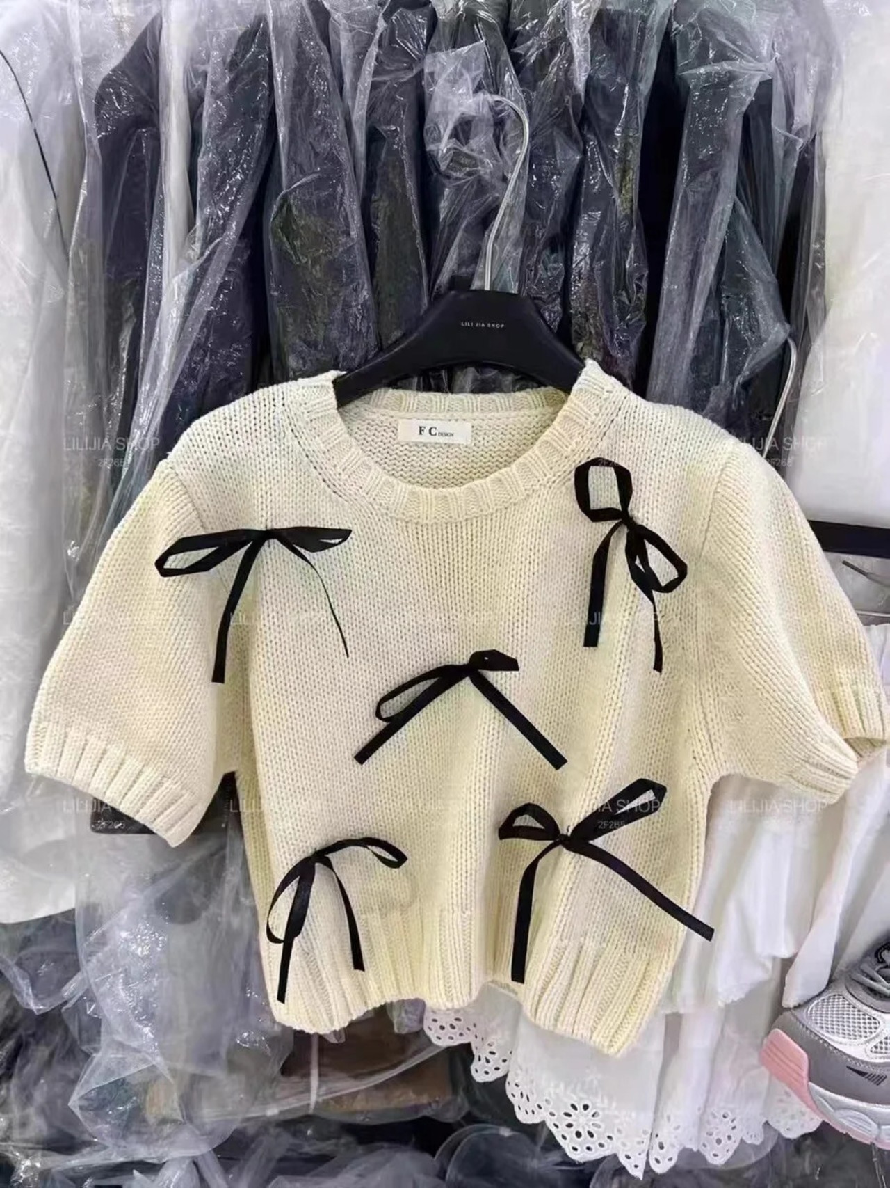 Nomikuma 2024 春夏万能スリムリボンカジュアルプルオーバーラウンドネック半袖ニットトップス ショート ハーフスリーブ スプリング 春物 サマー 夏物 Oネック