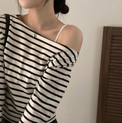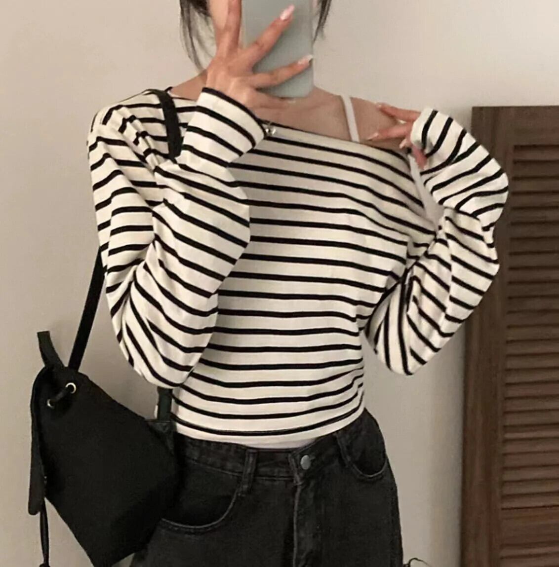 Nomikuma シックレトロストライプスキューカラーストラップレス長袖 Tシャツレディーススリム多用途トップシャツ ロング