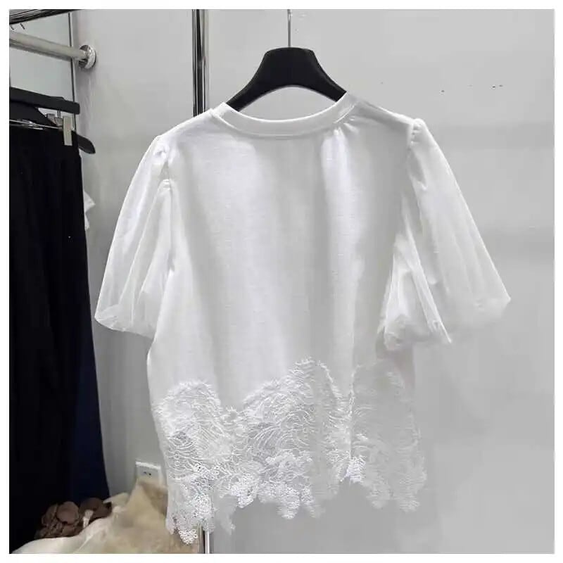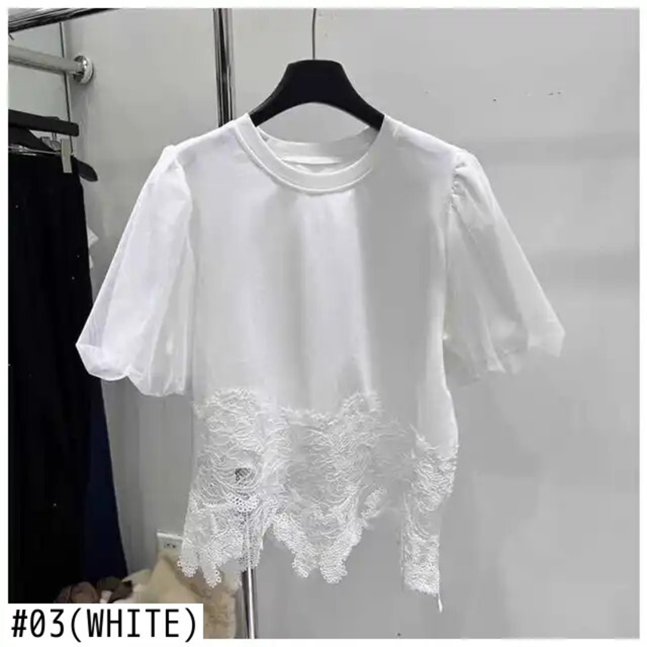 Nomikuma フレンチ イレギュラーヘム レース パッチワーク パフスリーブ Tシャツ レディース 2024 夏 おしゃれ トップス サマー 夏物