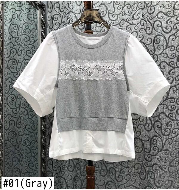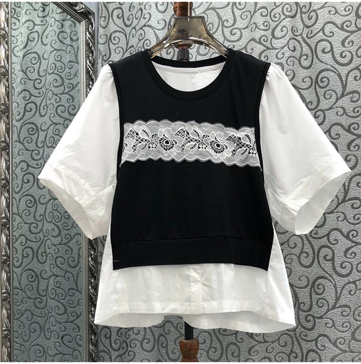 Nomikuma フェイク 2 ピース レース パッチワーク コントラスト ラウンド ネック 半袖 Tシャツ レディース 2024 夏 ニッチ トップ ショート ハーフスリーブ サマー 夏物 Oネック