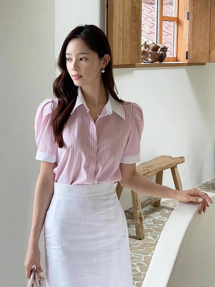 Nomikuma シック夏ニッチレトロコントラスト襟シングルブレスト多用途半袖ストライプシャツトップ ショート ハーフスリーブ サマー 夏物