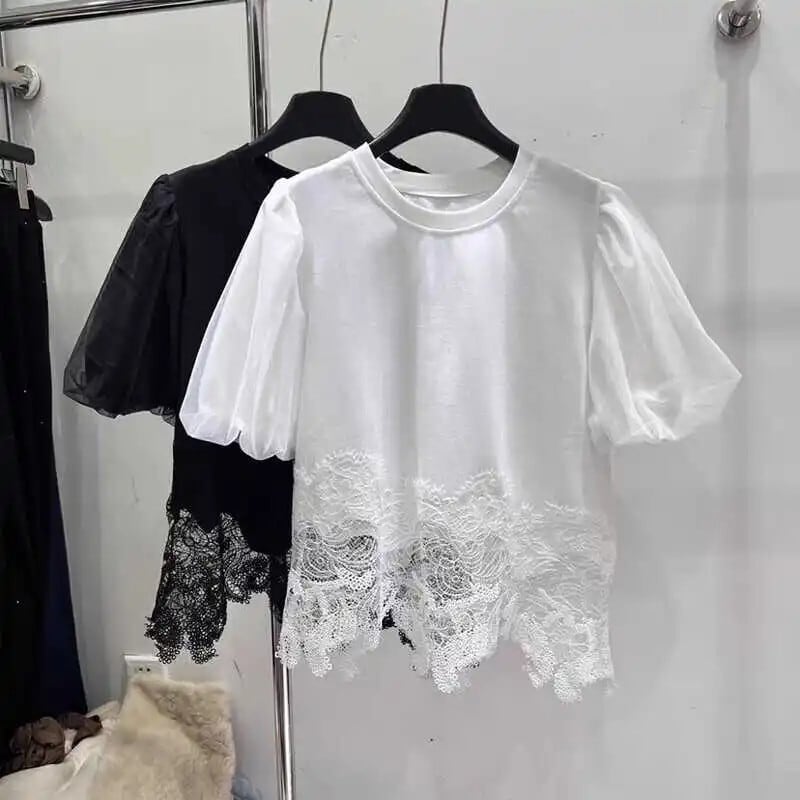 Nomikuma フレンチ不規則裾レースパッチワークパフスリーブ Tシャツレディース 2024 夏スタイリッシュトップグラフィック T シャツ サマー 夏物