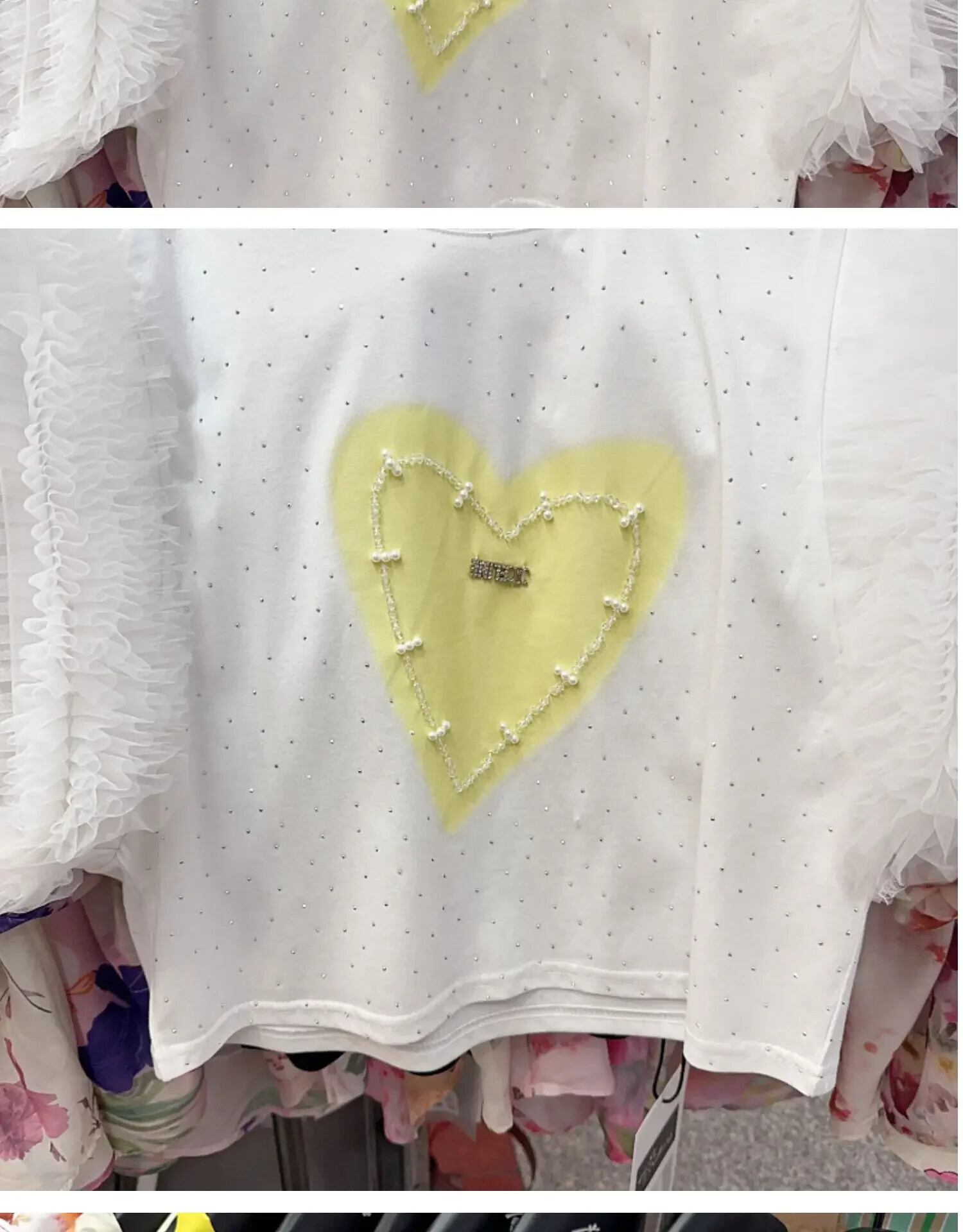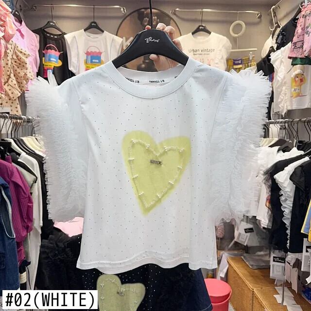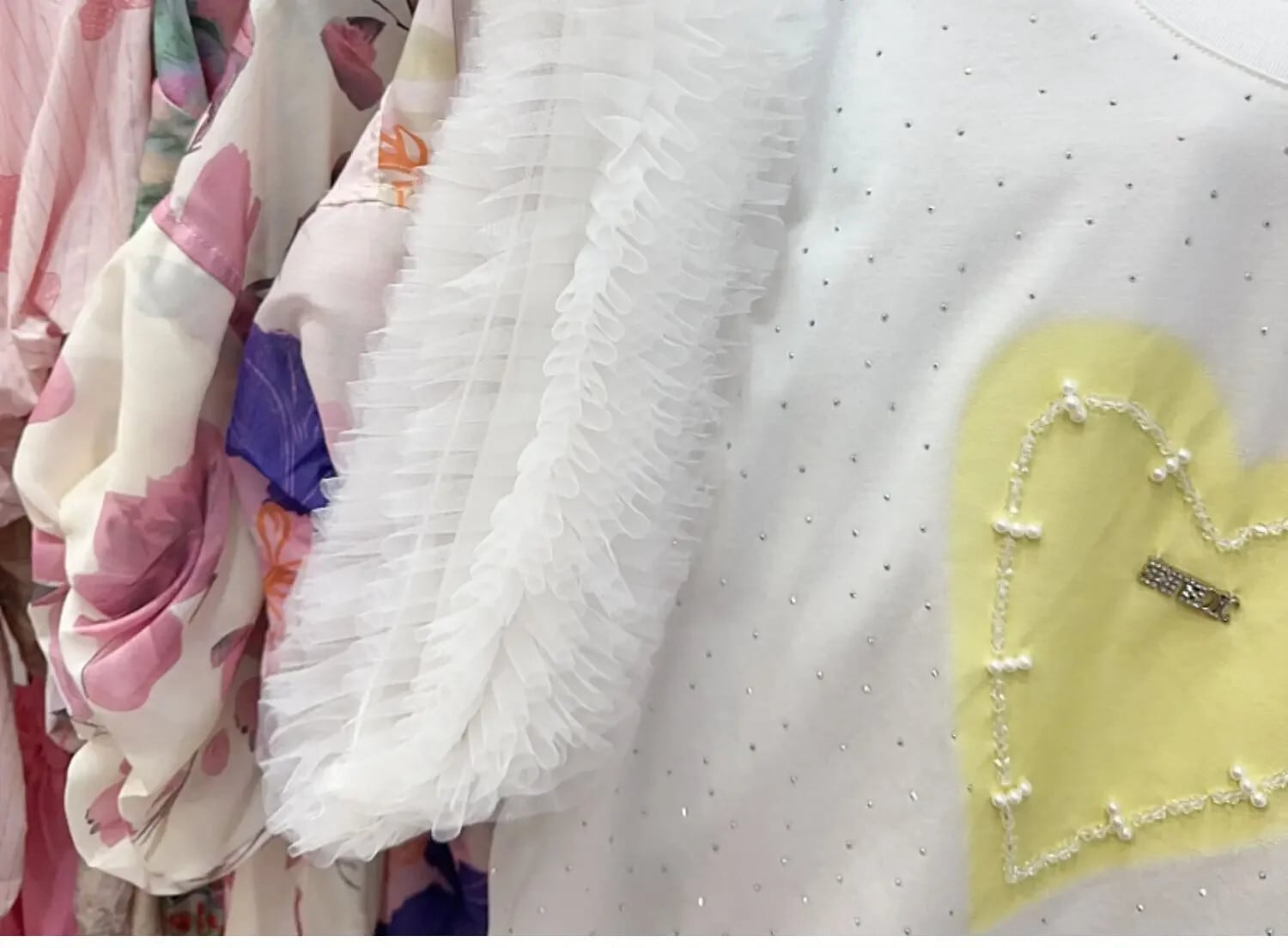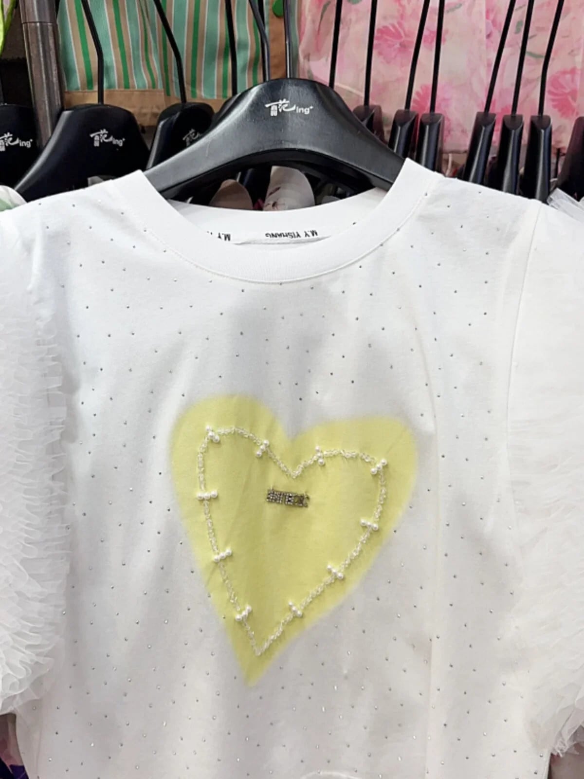 Nomikuma 2024 夏ファッションメッシュフライングスリーブパッチワークトップビーズハートプリントスタイル Tシャツ サマー 夏物